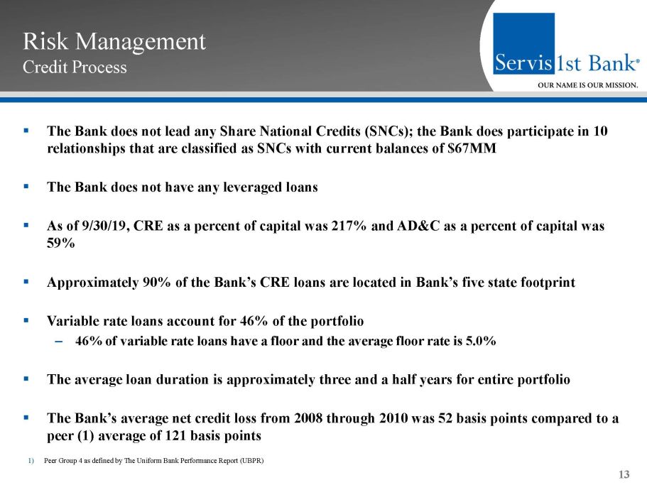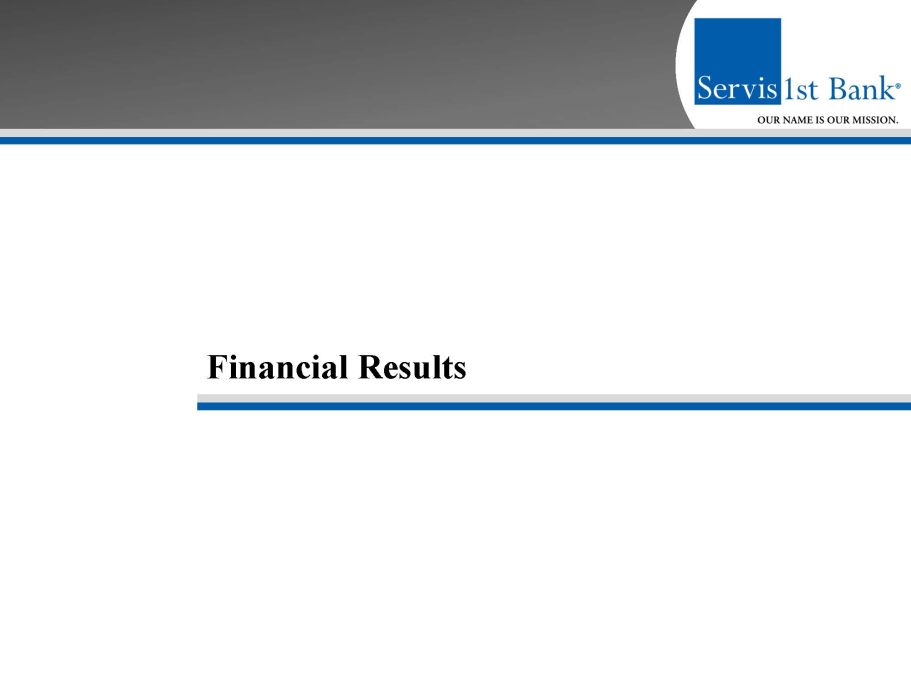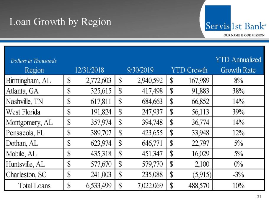 Forward - Looking Statements This presentation contains forward - looking statements within the meaning of the Private Securities Litigation Reform Act of 1995 . In addition, ServisFirst Bancshares, Inc . may file or furnish documents with the Securities and Exchange Commission which contain forward - looking statements and management may make forward - looking statements orally to analysts, investors, representatives of the media and others . These statements are based on the current beliefs and expectations of ServisFirst Bancshares, Inc . ’s management and are subject to significant risks and uncertainties . Actual results may differ from those set forth in the forward - looking statements . Factors that could cause ServisFirst Bancshares, Inc . ’s actual results to differ materially from those described in the forward - looking statements can be found in ServisFirst Bancshares, Inc . ’s Annual Report on Form 10 - K for the year ended December 31 , 2018 , and Quarterly Reports on Form 10 - Q for the quarters ended September 30 , 2019 , June 30 , 2019 , and March 31 , 2019 , which have been filed with the Securities and Exchange Commission and which are available on ServisFirst Bancshares, Inc . ’s website ( www . servisfirstbank . com ) and on the Securities and Exchange Commission’s website ( www . sec . gov ) . ServisFirst Bancshares, Inc . does not undertake to update the forward - looking statements to reflect the impact of circumstances or events that may arise after the date of the forward - looking statements . ▪ Non - GAAP Financial Measures This presentation includes non - GAAP financial measures . Information about any such non - GAAP financial measures, including a reconciliation of those measures to GAAP, can be found in the presentation . 2