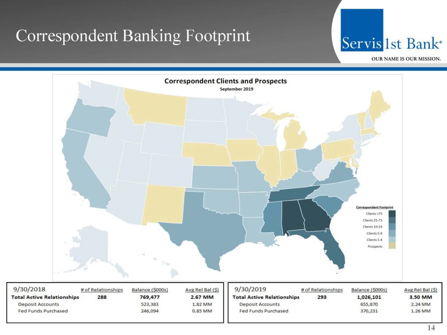 Risk Management Credit Process ▪ The Bank does not lead any Share National Credits (SNCs); the Bank does participate in 10 relationships that are classified as SNCs with current balances of $67MM ▪ The Bank does not have any leveraged loans ▪ As of 9/30/19, CRE as a percent of capital was 217% and AD&C as a percent of capital was 59% ▪ Approximately 90% of the Bank’s CRE loans are located in Bank’s five state footprint ▪ Variable rate loans account for 46% of the portfolio – 46% of variable rate loans have a floor and the average floor rate is 5.0% ▪ The average loan duration is approximately three and a half years for entire portfolio ▪ The Bank’s average net credit loss from 2008 through 2010 was 52 basis points compared to a peer (1) average of 121 basis points 13 1) Peer Group 4 as defined by The Uniform Bank Performance Report (UBPR)