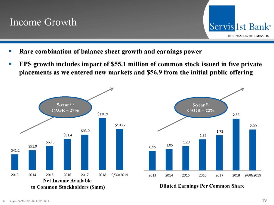 Balance Sheet Growth 18 5 - year (1) CAGR = 18% 5 - year (1) CAGR = 18% Gross Loans ($mm) Total Deposits ($mm) ▪ 5 - year (1) CAGR of gross loans and total deposits = 18% ▪ 5 - year (1) CAGR of non - interest bearing deposits = 19% ▪ 5 - year (1) CAGR of C&I loans = 14% $2,859 $3,360 $4,216 $4,912 $5,851 $6,533 $7,022 2013 2014 2015 2016 2017 2018 9/30/2019 1) 5 – year CAGR = 12/31/2013 – 12/31/2018 $3,020 $3,398 $4,224 $5,420 $6,092 $6,916 $7,724 2013 2014 2015 2016 2017 2018 9/30/2019