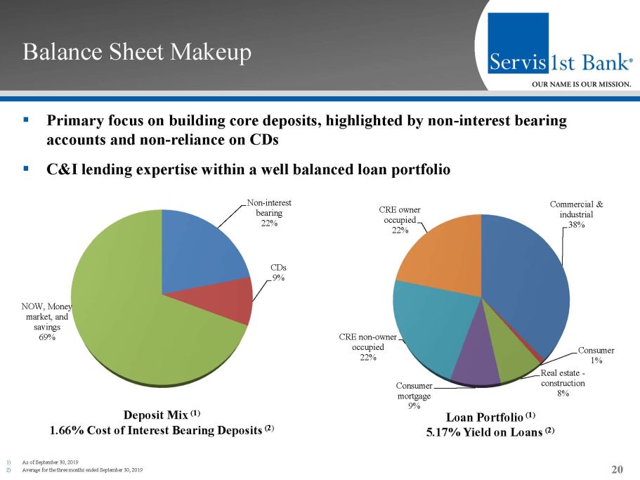 ▪ Rare combination of balance sheet growth and earnings power ▪ EPS growth includes impact of $55.1 million of common stock issued in five private placements as we entered new markets and $56.9 from the initial public offering Income Growth 19 5 - year (1) CAGR = 27% 5 - year (1) CAGR = 22% Net Income Available to Common Stockholders ($mm) Diluted Earnings Per Common Share $41.2 $51.9 $63.3 $81.4 $93.0 $136.9 $108.2 2013 2014 2015 2016 2017 2018 9/30/2019 0.95 1.05 1.20 1.52 1.72 2.53 2.00 2013 2014 2015 2016 2017 2018 9/30/2019 1) 5 – year CAGR = 12/31/2013 – 12/31/2018