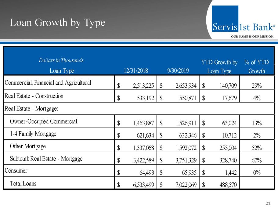 Loan Growth by Region 21 12/31/2018 9/30/2019 YTD Growth YTD Annualized Growth Rate 2,772,603$ 2,940,592$ 167,989$ 8% 325,615$ 417,498$ 91,883$ 38% 617,811$ 684,663$ 66,852$ 14% 191,824$ 247,937$ 56,113$ 39% 357,974$ 394,748$ 36,774$ 14% 389,707$ 423,655$ 33,948$ 12% 623,974$ 646,771$ 22,797$ 5% 435,318$ 451,347$ 16,029$ 5% 577,670$ 579,770$ 2,100$ 0% 241,003$ 235,088$ (5,915)$ -3% 6,533,499$ 7,022,069$ 488,570$ 10% Dollars in Thousands Region Total Loans Mobile, AL Atlanta, GA Charleston, SC Dothan, AL West Florida Huntsville, AL Pensacola, FL Montgomery, AL Birmingham, AL Nashville, TN