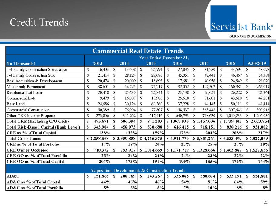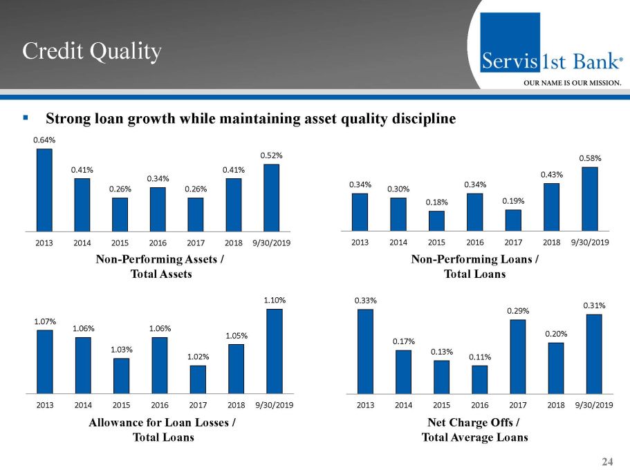 Credit Trends 23 (In Thousands) 2013 2014 2015 2016 2017 2018 9/30/2019 1-4 Family Construction Speculative 16,403$ 13,608$ 25,794$ 27,835$ 31,230$ 34,594$ 48,073$ 1-4 Family Construction Sold 21,414$ 28,124$ 29,086$ 45,051$ 47,441$ 46,467$ 54,384$ Resi Acquisition & Development 20,474$ 20,009$ 18,693$ 17,681$ 40,956$ 24,542$ 28,020$ Multifamily Permanent 38,601$ 54,725$ 71,217$ 92,052$ 127,502$ 160,981$ 266,017$ Residential Lot Loans 20,418$ 25,630$ 27,844$ 23,138$ 20,059$ 26,222$ 24,761$ Commercial Lots 9,479$ 16,007$ 17,986$ 25,618$ 31,601$ 43,610$ 47,231$ Raw Land 24,686$ 30,124$ 60,360$ 37,228$ 44,145$ 50,111$ 48,414$ Commercial Construction 50,389$ 76,904$ 72,807$ 158,537$ 365,442$ 307,645$ 300,916$ Other CRE Income Property 273,806$ 341,262$ 517,416$ 640,793$ 748,630$ 1,045,233$ 1,206,036$ Total CRE (Excluding O/O CRE) 475,671$ 606,394$ 841,203$ 1,067,930$ 1,457,006$ 1,739,405$ 2,023,854$ Total Risk-Based Capital (Bank Level) 343,904$ 458,073$ 530,688$ 616,415$ 718,151$ 838,216$ 931,002$ CRE as % of Total Capital 138% 132% 159% 173% 203% 208% 217% Total Gross Loans 2,858,868$ 3,359,858$ 4,216,375$ 4,911,770$ 5,851,261$ 6,533,499$ 7,022,069$ CRE as % of Total Portfolio 17% 18% 20% 22% 25% 27% 29% CRE Owner Occupied 710,372$ 793,917$ 1,014,669$ 1,171,719$ 1,328,666$ 1,463,887$ 1,527,656$ CRE OO as % of Total Portfolio 25% 24% 24% 24% 23% 22% 22% CRE OO as % of Total Capital 207% 173% 191% 190% 185% 175% 164% AD&C 151,868$ 208,769$ 243,267$ 335,085$ 580,874$ 533,191$ 551,801$ AD&C as % of Total Capital 44% 46% 46% 54% 81% 64% 59% AD&C as % of Total Portfolio 5% 6% 6% 7% 10% 8% 8% Commercial Real Estate Trends Acquisition, Development, & Construction Trends Year Ended December 31,