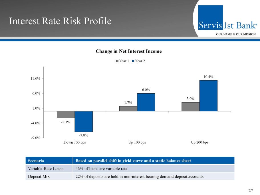 ▪ Our operating structure and business strategy enable efficient, profitable growth Efficiency 26 Core Efficiency Ratio (1) and Core Non - interest Expense / Average Assets (1) (1) (1) 45.54% 41.54% 38.69% 38.75% 40.60% 39.47 34.71% 32.57% 34.17% 1.79% 1.64% 1.51% 1.47% 1.55% 1.41 1.32% 1.26% 1.23% 0.00% 1.00% 2.00% 3.00% 4.00% 5.00% 2011 2012 2013 2014 2015 2016 2017 2018 2019 0.00% 10.00% 20.00% 30.00% 40.00% 50.00% 60.00% 70.00% Core Efficiency Ratio Core Non-interest Expense / Average Assets 1) For a reconciliation of these non - GAAP measures to the most comparable GAAP measure, see "GAAP Reconciliation and Management Explanation of Non - GAAP Financial Measures" included on page 38 of this presentation .