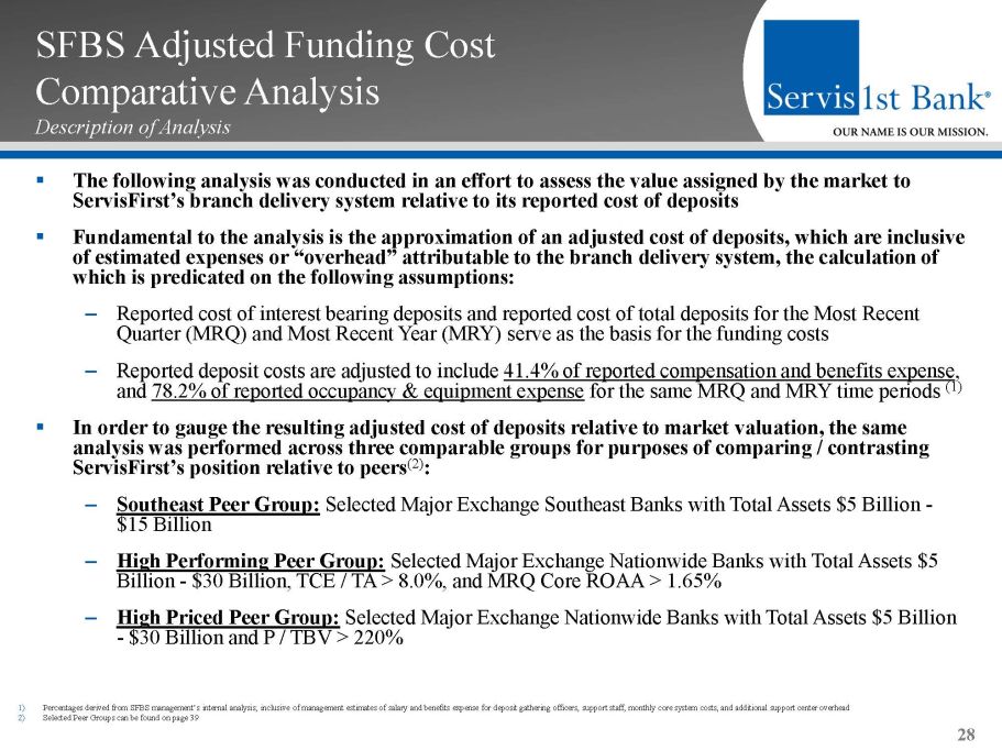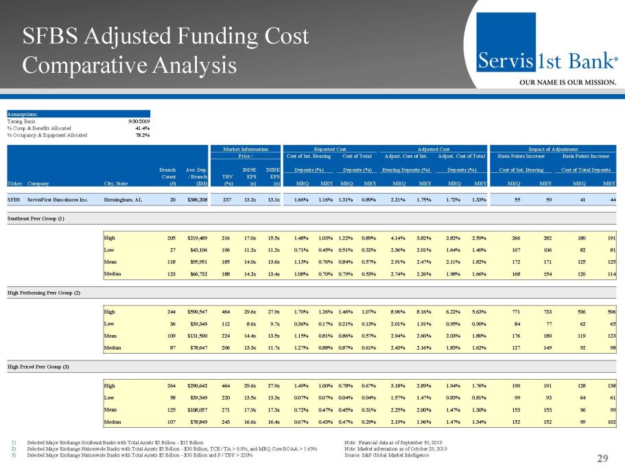 SFBS Adjusted Funding Cost Comparative Analysis Description of Analysis ▪ The following analysis was conducted in an effort to assess the value assigned by the market to ServisFirst’s branch delivery system relative to its reported cost of deposits ▪ Fundamental to the analysis is the approximation of an adjusted cost of deposits, which are inclusive of estimated expenses or “overhead” attributable to the branch delivery system, the calculation of which is predicated on the following assumptions: – Reported cost of interest bearing deposits and reported cost of total deposits for the Most Recent Quarter (MRQ) and Most Recent Year (MRY) serve as the basis for the funding costs – Reported deposit costs are adjusted to include 41.4% of reported compensation and benefits expense , and 78.2% of reported occupancy & equipment expense for the same MRQ and MRY time periods (1) ▪ In order to gauge the resulting adjusted cost of deposits relative to market valuation, the same analysis was performed across three comparable groups for purposes of comparing / contrasting ServisFirst’s position relative to peers (2) : – Southeast Peer Group: Selected Major Exchange Southeast Banks with Total Assets $5 Billion - $15 Billion – High Performing Peer Group: Selected Major Exchange Nationwide Banks with Total Assets $5 Billion - $30 Billion, TCE / TA > 8.0%, and MRQ Core ROAA > 1.65% – High Priced Peer Group: Selected Major Exchange Nationwide Banks with Total Assets $5 Billion - $30 Billion and P / TBV > 220% 28 1) Percentages derived from SFBS management’s internal analysis ; inclusive of management estimates of salary and benefits expense for deposit gathering officers, support staff, monthly core system costs, and additional support center overhead 2) Selected Peer Groups can be found on page 39