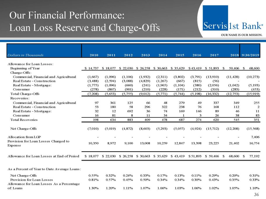 Our Financial Performance: Asset Quality 35 Dollars in Thousands 2011 2012 2013 2014 2015 2016 2017 2018 9/30/2019 Nonaccrual Loans: 1-4 Family 670 453 1,878 1,596 198 74 459 2,046 1,479 Owner-Occupied Commercial Real Estate 792 2,786 1,435 683 -- -- 556 3,358 15,127 Other Real Estate Loans 693 240 243 959 1,619 -- -- 5,022 1,507 Commercial, Financial & Agricultural 1,179 276 1,714 172 1,918 7,282 9,712 10,503 16,031 Construction 10,063 6,460 3,749 5,049 4,000 3,268 -- 997 1,588 Consumer 375 135 602 666 31 -- 38 -- -- Total Nonaccrual Loans 13,772 10,350 9,621 9,125 7,766 10,624 10,765 21,926 35,732 Total 90+ Days Past Due & Accruing -- 8 115 925 1 6,263 60 5,844 5,317 Total Nonperforming Loans 13,772 10,358 9,736 10,050 7,767 16,887 10,825 27,770 41,049 Other Real Estate Owned & Repossessions 12,305 9,721 12,861 6,840 5,392 4,988 6,701 5,169 5,337 Total Nonperforming Assets 26,077 20,079 22,597 16,890 13,159 21,875 17,526 32,939 46,386 Troubled Debt Restructurings (TDRs) (Accruing): 1-4 Family -- 1,709 8,225 -- -- -- 850 -- -- Owner-Occupied Commercial Real Estate 2,785 3,121 -- -- -- -- 3,664 -- 726 Other Real Estate Loans 331 302 285 1,663 253 204 -- -- -- Commercial, Financial & Agricultural 1,369 1,168 962 6,632 6,618 354 11,438 3,073 2,742 Construction -- 3,213 217 -- -- -- 997 -- -- Consumer -- -- -- -- -- -- -- -- -- Total TDRs (Accruing) 4,485 9,513 9,689 8,295 6,871 558 16,949 3,073 3,468 Total Nonperforming Assets & TDRs (Accruing) 30,562 29,592 32,286 25,185 20,030 22,433 34,475 36,012 49,854 Total Nonperforming Loans to Total Loans 0.75% 0.44% 0.34% 0.30% 0.18% 0.34% 0.19% 0.43% 0.58% Total Nonperforming Assets to Total Assets 1.06% 0.69% 0.64% 0.41% 0.26% 0.34% 0.25% 0.41% 0.52% Total Nonperforming Assets & TDRs (Accruing) to Total Assets 1.24% 1.02% 0.92% 0.61% 0.39% 0.35% 0.49% 0.45% 0.57%