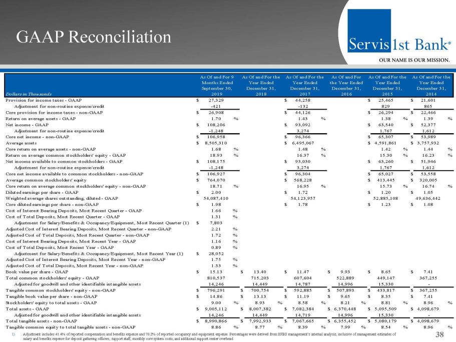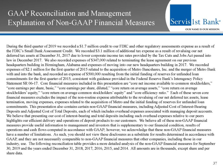 GAAP Reconciliation and Management Explanation of Non - GAAP Financial Measures 37 During the third quarter of 2019 we recorded a $1.7 million credit to our FDIC and other regulatory assessments expense as a res ult of the FDIC’s Small Bank Assessment Credit. We recorded $3.1 million of additional tax expense as a result of revaluing our net deferred tax assets at December 31, 2017 due to lower corporate income tax rates provided by the Tax Cuts and Jobs Act passed in to law in December 2017. We also recorded expenses of $347,000 related to terminating the lease agreement on our previous headquarters building in Birmingham, Alabama and expenses of moving into our new headquarters building in 2017. We recorded expenses of $2.1 million for the first quarter of 2015 related to the acquisition of Metro Bancshares, Inc. and the merger of Me tro Bank with and into the bank, and recorded an expense of $500,000 resulting from the initial funding of reserves for unfunded loan commitments for the first quarter of 2015, consistent with guidance provided in the Federal Reserve Bank’s Interagency Policy Statement SR 06 - 17. Core financial measures included in this presentation are “core net income available to common stockholders ,” “core earnings per share, basic,” “core earnings per share, diluted,” “core return on average assets,” “core return on averag e stockholders’ equity,” “core return on average common stockholders’ equity” and “core efficiency ratio.” Each of these seven co re financial measures excludes the impact of the non - routine expense attributable to the revaluing of our net deferred tax assets, lease termination, moving expenses, expenses related to the acquisition of Metro and the initial funding of reserves for unfunded l oan commitments. This presentation also contains certain non - GAAP financial measures, including Adjusted Cost of Interest - Bearing Deposits and Adjusted Cost of Total Deposits, each of which includes overhead expenses associated with managing deposit accou nts . We believe that presenting our cost of interest - bearing and total deposits including such overhead expenses relative to our peer s highlights our efficient delivery and operations of deposit products to our customers. We believe all of these non - GAAP financial measures provide useful information to management and investors that is supplementary to our financial condition, results of operations and cash flows computed in accordance with GAAP; however, we acknowledge that these non - GAAP financial measures have a number of limitations. As such, you should not view these disclosures as a substitute for results determined in accor dan ce with GAAP, and they are not necessarily comparable to non - GAAP financial measures that other companies, including those in our industry, use. The following reconciliation table provides a more detailed analysis of the non - GAAP financial measures for Sept ember 30, 2019 and the years ended December 31, 2018, 2017, 2016, 2015, and 2014. All amounts are in thousands, except share and p er share data.
