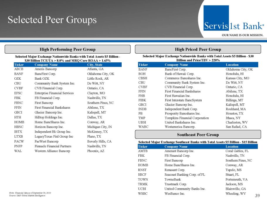 GAAP Reconciliation 38 Dollars in Thousands $ 27,329 $ 44,258 $ 25,465 $ 21,601 Adjustment for non-routine expense/credit -421 -132 829 865 $ 26,908 $ 44,126 $ 26,294 $ 22,466 1.70 % 1.43 % 1.38 % 1.39 % $ 108,206 $ 93,092 $ 63,540 $ 52,377 Adjustment for non-routine expense/credit -1,248 3,274 1,767 1,612 $ 106,958 $ 96,366 $ 65,307 $ 53,989 $ 8,505,310 $ 6,495,067 $ 4,591,861 $ 3,757,932 1.68 % 1.48 % 1.42 % 1.44 % 18.93 % 16.37 % 15.30 % 16.23 % $ 108,175 $ 93,030 $ 63,260 $ 51,946 Adjustment for non-routine expense/credit -1,248 3,274 1,767 1,612 $ 106,927 $ 96,304 $ 65,027 $ 53,558 $ 764,070 $ 568,228 $ 413,445 $ 320,005 18.71 % 16.95 % 15.73 % 16.74 % $ 2.00 $ 1.72 $ 1.20 $ 1.05 54,087,410 54,123,957 52,885,108 49,636,442 $ 1.98 $ 1.78 $ 1.23 $ 1.08 1.66 % 1.31 % Adjustment for Salary/Benefits & Occupancy/Equipment, Most Recent Quarter (1) $ 7,803 2.21 % 1.72 % 1.16 % 0.89 % Adjustment for Salary/Benefits & Occupancy/Equipment, Most Recent Year (1) $ 28,052 1.75 % 1.33 % $ 15.13 $ 13.40 $ 11.47 $ 9.93 $ 8.65 $ 7.41 810,537 715,203 607,604 522,889 449,147 367,255 Adjusted for goodwill and other identifiable intangible assets 14,246 14,449 14,787 14,996 15,330 - $ 796,291 $ 700,754 $ 592,885 $ 507,893 $ 433,817 $ 367,255 $ 14.86 $ 13.13 $ 11.19 $ 9.65 $ 8.35 $ 7.41 9.00 % 8.93 % 8.58 % 8.21 % 8.81 % 8.96 % $ 9,005,112 $ 8,007,382 $ 7,082,384 $ 6,370,448 $ 5,095,509 $ 4,098,679 Adjusted for goodwill and other identifiable intangible assets 14,246 14,449 14,719 14,996 15,330 - $ 8,990,866 $ 7,992,933 $ 7,067,665 $ 6,355,452 $ 5,080,179 $ 4,098,679 8.86 % 8.77 % 8.39 % 7.99 % 8.54 % 8.96 % Cost of Total Deposits, Most Recent Quarter - GAAP Cost of Total Deposits, Most Recent Year - GAAP Adjusted Cost of Interest Bearing Deposits, Most Recent Quarter - non-GAAP Adjusted Cost of Total Deposits, Most Recent Quarter - non-GAAP Adjusted Cost of Interest Bearing Deposits, Most Recent Year - non-GAAP Average common stockholders' equity Core return on average common stockholders' equity - non-GAAP Tangible book value per share - non-GAAP As Of and For the Year Ended December 31, 2014 Book value per share - GAAP As Of and For the Year Ended December 31, 2015 Provision for income taxes - GAAP Return on average assets - GAAP Core net income - non-GAAP As Of and For the Year Ended December 31, 2016 As Of and For the Year Ended December 31, 2017 As Of and For the Year Ended December 31, 2018 As Of and For 9 Months Ended September 30, 2019 Cost of Interest Bearing Deposits, Most Recent Quarter - GAAP Cost of Interest Bearing Deposits, Most Recent Year - GAAP Adjusted Cost of Total Deposits, Most Recent Year - non-GAAP Stockholders' equity to total assets - GAAP Total assets - GAAP Total tangible assets - non-GAAP Tangible common equity to total tangible assets - non-GAAP Core provision for income taxes - non-GAAP Net income - GAAP Core diluted earnings per share - non-GAAP Total common stockholders' equity - GAAP Tangible common stockholders' equity - non-GAAP Average assets Core return on average assets - non-GAAP Return on average common stockholders' equity - GAAP Net income available to common stockholders - GAAP Diluted earnings per share - GAAP Weighted average shares outstanding, diluted - GAAP Core net income available to common stockholders - non-GAAP 1) Adjustment includes 41 . 4 % of reported compensation and benefits expense and 78 . 2 % of reported occupancy and equipment expense . Percentages were derived from SFBS management’s internal analysis ; inclusive of management estimates of salary and benefits expense for deposit gathering officers, support staff, monthly core system costs, and additional support center overhead