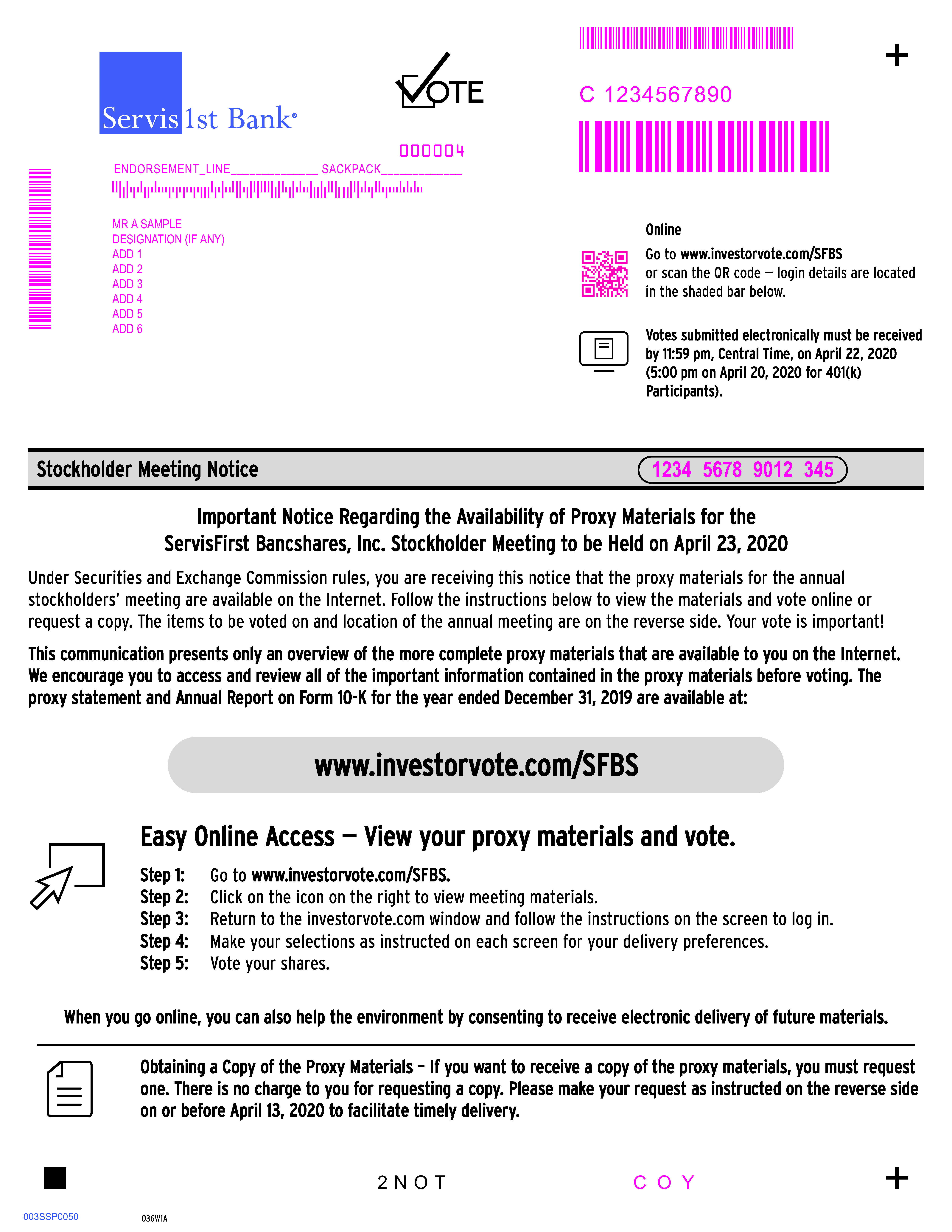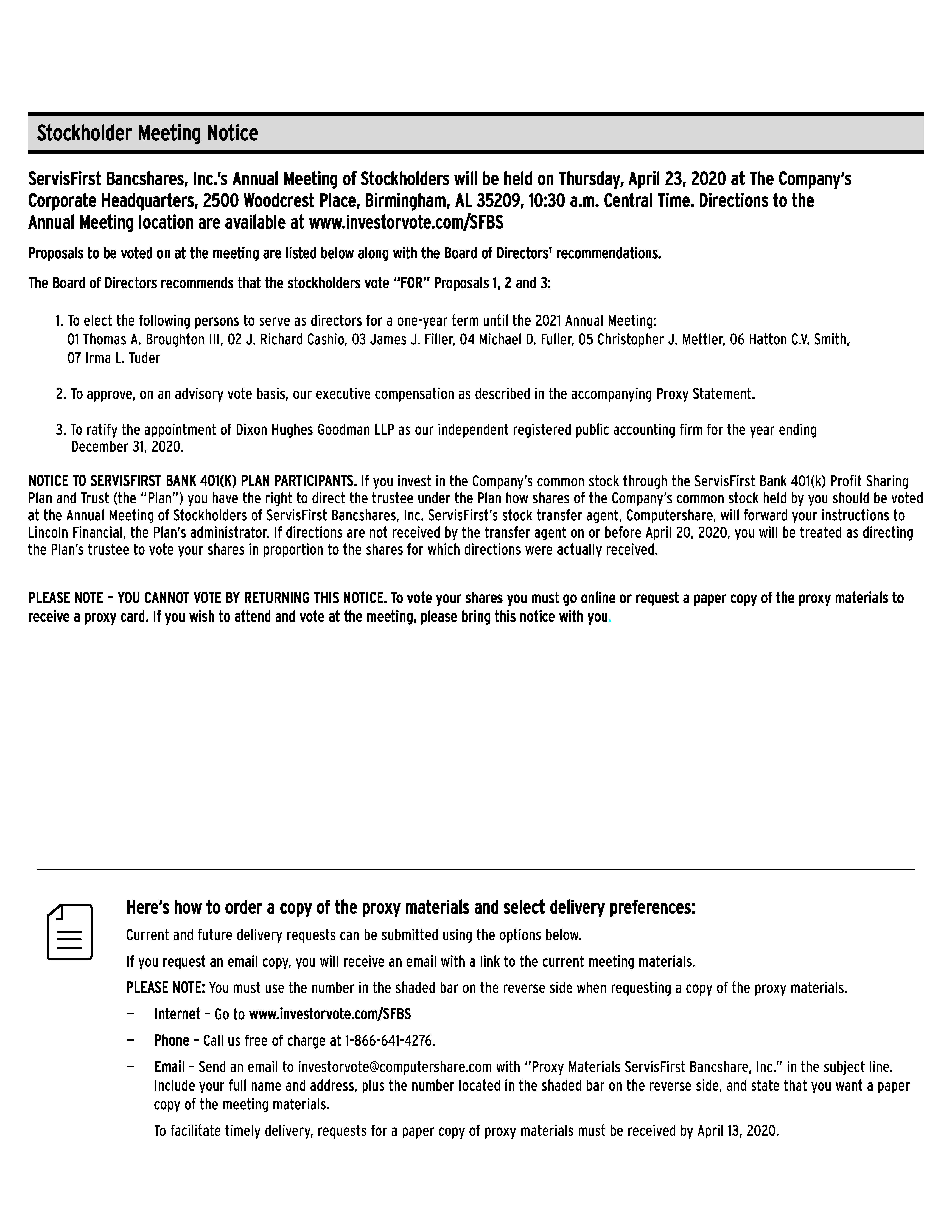 To request a printed copy of the proxy materials, please call 1-866-641-4276, visit www.investorvote.com/SFBS or email investorvote@computershare.com with “Proxy Materials ServisFirst Bancshares, Inc.” in the subject line. To make your request, you will need the 15-digit control number printed on your Notice of Internet Availability of Proxy Materials or proxy card.