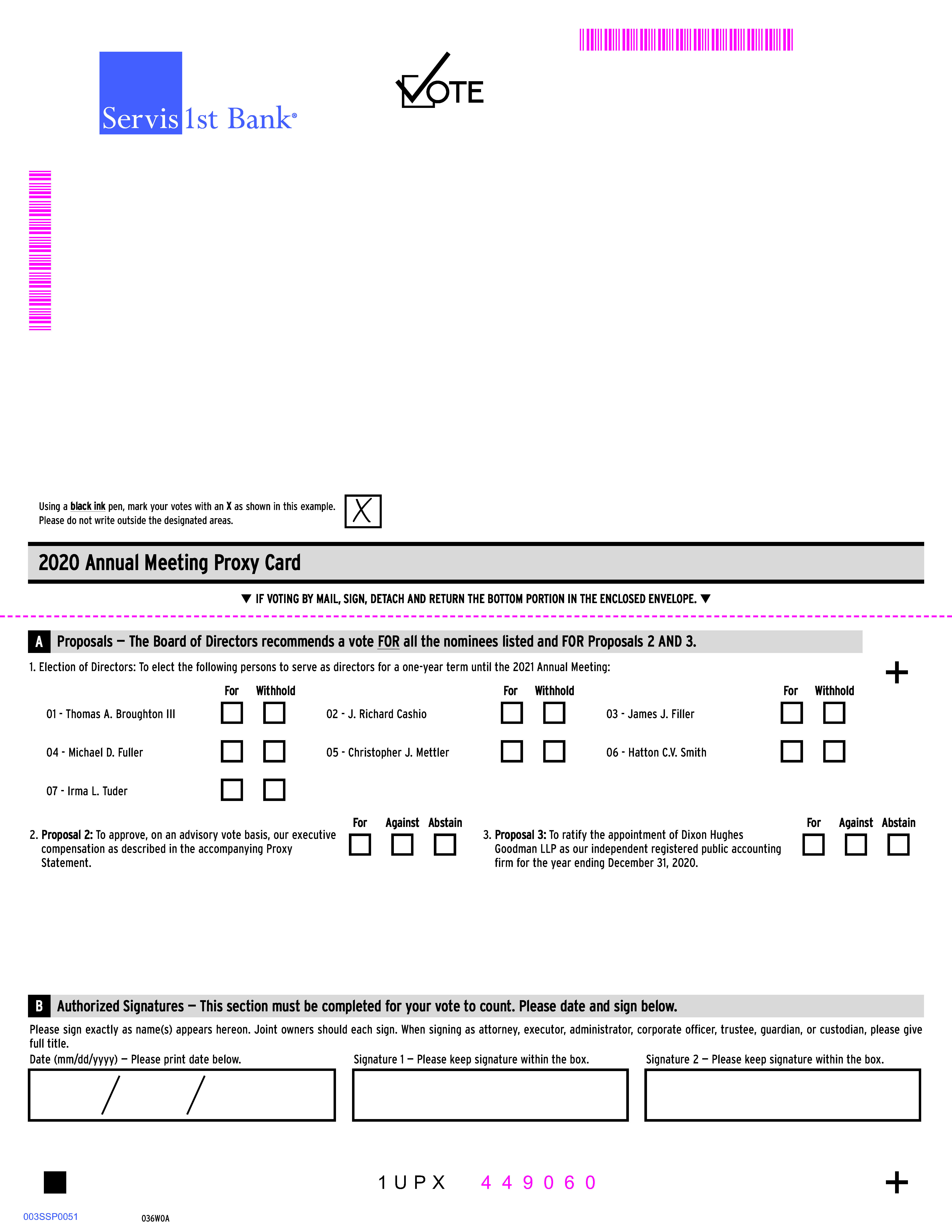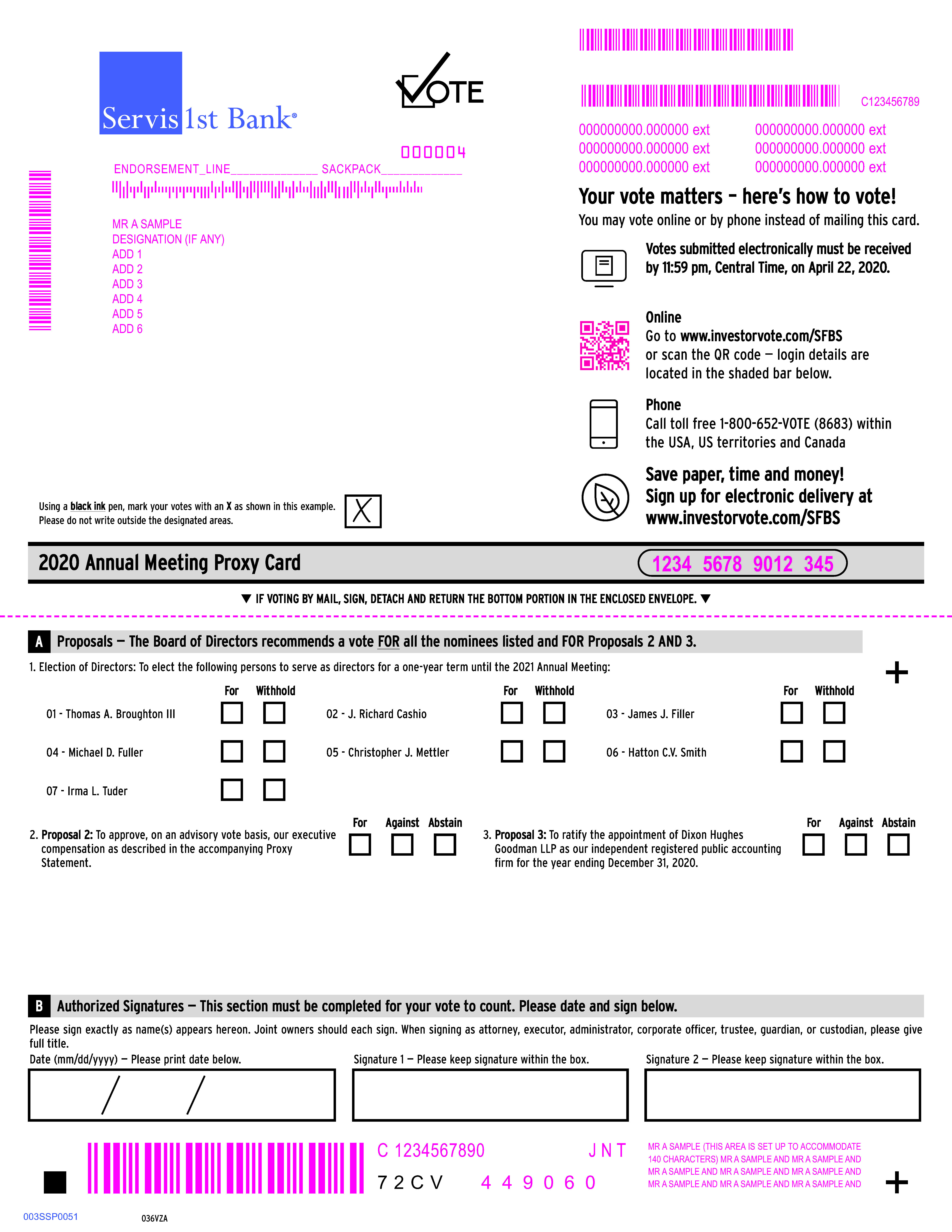 If you invest in our common stock through the company stock fund in the ServisFirst Bank 401(k) Profit Sharing Plan and Trust, you will receive instructions for submitting your voting directions from the 401(k) plan’s administrator, Lincoln Financial. The 401(k) plan’s trustees will vote shares held by the 401(k) plan in accordance with the tabulation. Any shares for which the trustees do not received timely voting directions will be voted by the trustees in proportion to the shares for which directions were actually received. To allow the trustees sufficient time to process voting directions, the voting deadline for 401(k) plan participants is 5:00 p.m., Central Time, on April 20, 2020.