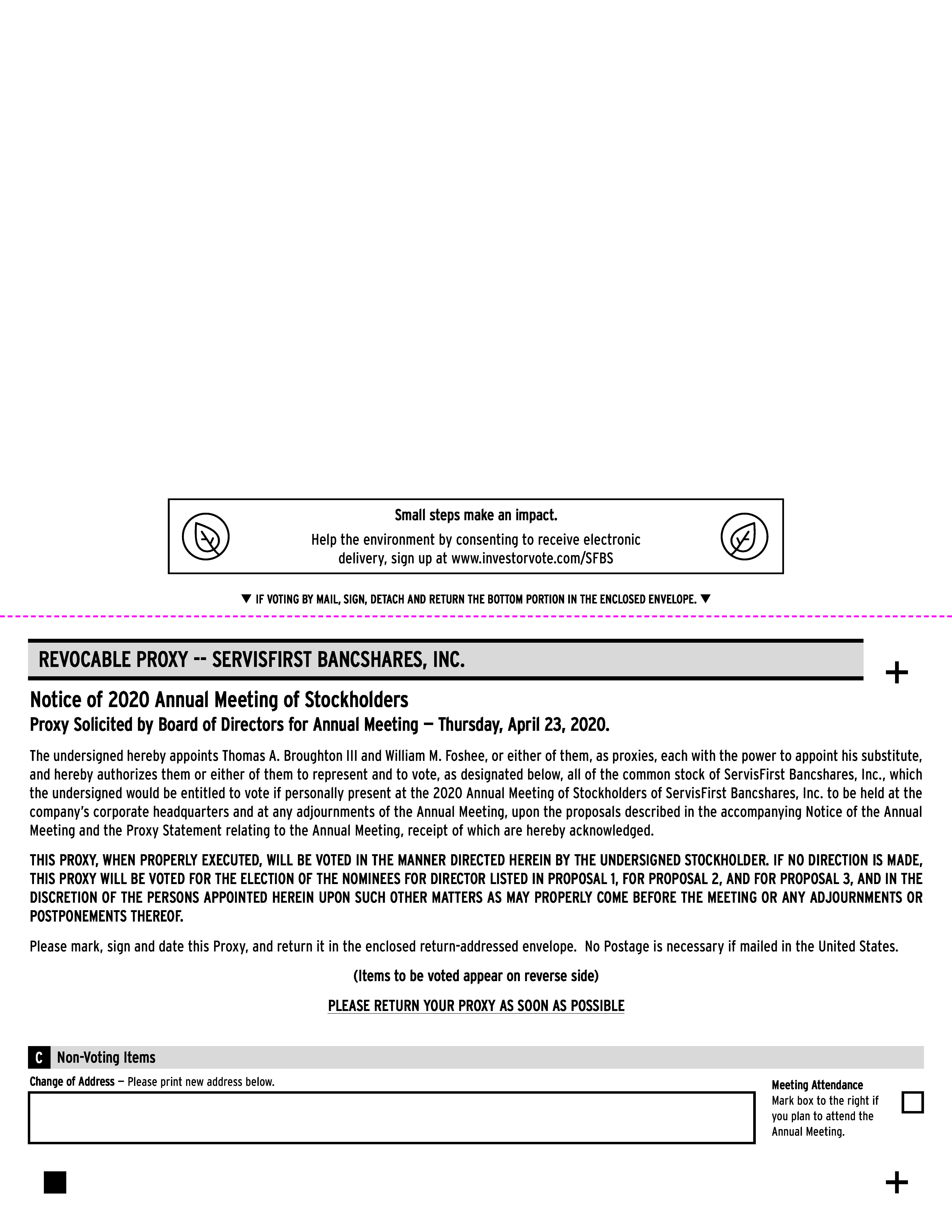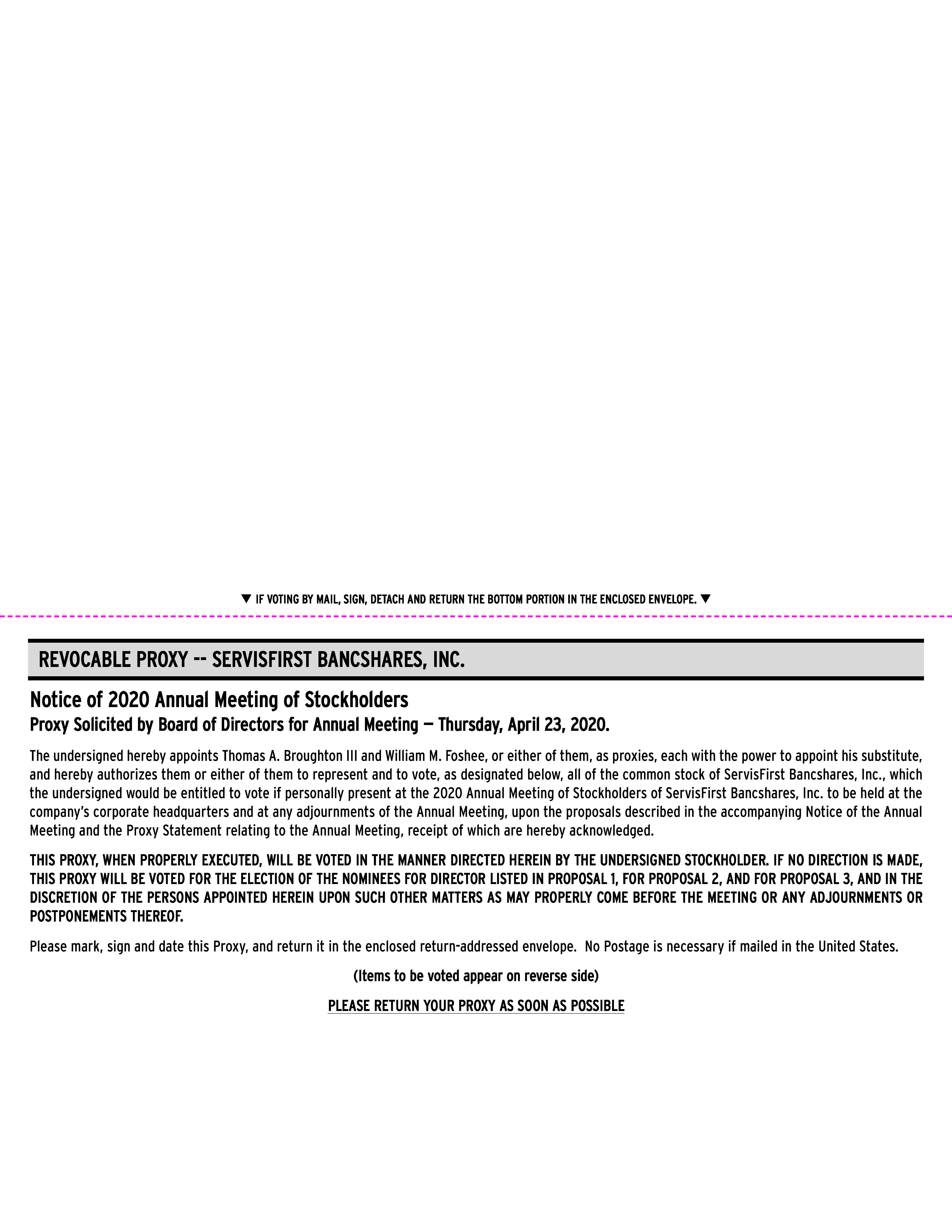 You are cordially invited to attend the Annual Meeting of Stockholders of ServisFirst Bancshares, Inc. Our Annual Meeting will be held at the company’s corporate headquarters, located at 2500 Woodcrest Place, Birmingham, Alabama 35209, on April 23, 2020, at 10:30 a.m., Central Daylight Time.