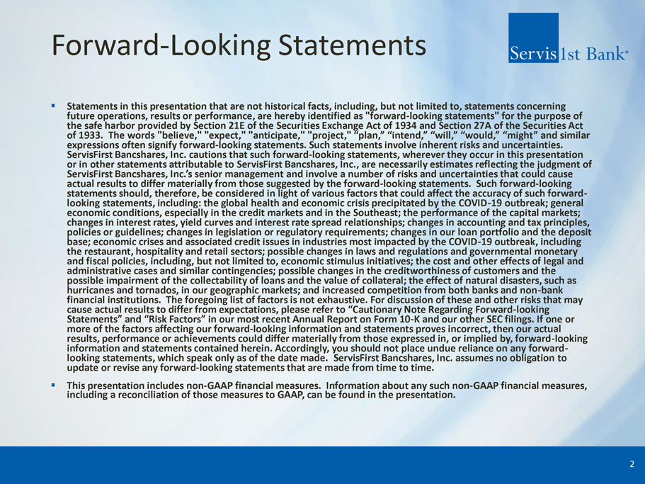 Forward - Looking Statements ▪ Statements in this presentation that are not historical facts, including, but not limited to, statements concerning future operations, results or performance, are hereby identified as "forward - looking statements" for the purpose of the safe harbor provided by Section 21E of the Securities Exchange Act of 1934 and Section 27A of the Securities Act of 1933. The words "believe," "expect," "anticipate," "project," “plan,” “intend,” “will,” “would,” “might” and similar expressions often signify forward - looking statements. Such statements involve inherent risks and uncertainties. ServisFirst Bancshares, Inc. cautions that such forward - looking statements, wherever they occur in this presentation or in other statements attributable to ServisFirst Bancshares, Inc., are necessarily estimates reflecting the judgment of ServisFirst Bancshares, Inc.’s senior management and involve a number of risks and uncertainties that could cause actual results to differ materially from those suggested by the forward - looking statements. Such forward - looking statements should, therefore, be considered in light of various factors that could affect the accuracy of such forward - looking statements, including: the global health and economic crisis precipitated by the COVID - 19 outbreak; general economic conditions, especially in the credit markets and in the Southeast; the performance of the capital markets; changes in interest rates, yield curves and interest rate spread relationships; changes in accounting and tax principles, policies or guidelines; changes in legislation or regulatory requirements; changes in our loan portfolio and the deposit base; economic crises and associated credit issues in industries most impacted by the COVID - 19 outbreak, including the restaurant, hospitality and retail sectors; possible changes in laws and regulations and governmental monetary and fiscal policies, including, but not limited to, economic stimulus initiatives; the cost and other effects of legal and administrative cases and similar contingencies; possible changes in the creditworthiness of customers and the possible impairment of the collectability of loans and the value of collateral; the effect of natural disasters, such as hurricanes and tornados, in our geographic markets; and increased competition from both banks and non - bank financial institutions. The foregoing list of factors is not exhaustive. For discussion of these and other risks that may cause actual results to differ from expectations, please refer to “Cautionary Note Regarding Forward - looking Statements” and “Risk Factors” in our most recent Annual Report on Form 10 - K and our other SEC filings. If one or more of the factors affecting our forward - looking information and statements proves incorrect, then our actual results, performance or achievements could differ materially from those expressed in, or implied by, forward - looking information and statements contained herein. Accordingly, you should not place undue reliance on any forward - looking statements, which speak only as of the date made. ServisFirst Bancshares, Inc. assumes no obligation to update or revise any forward - looking statements that are made from time to time. ▪ This presentation includes non - GAAP financial measures. Information about any such non - GAAP financial measures, including a reconciliation of those measures to GAAP, can be found in the presentation. 2