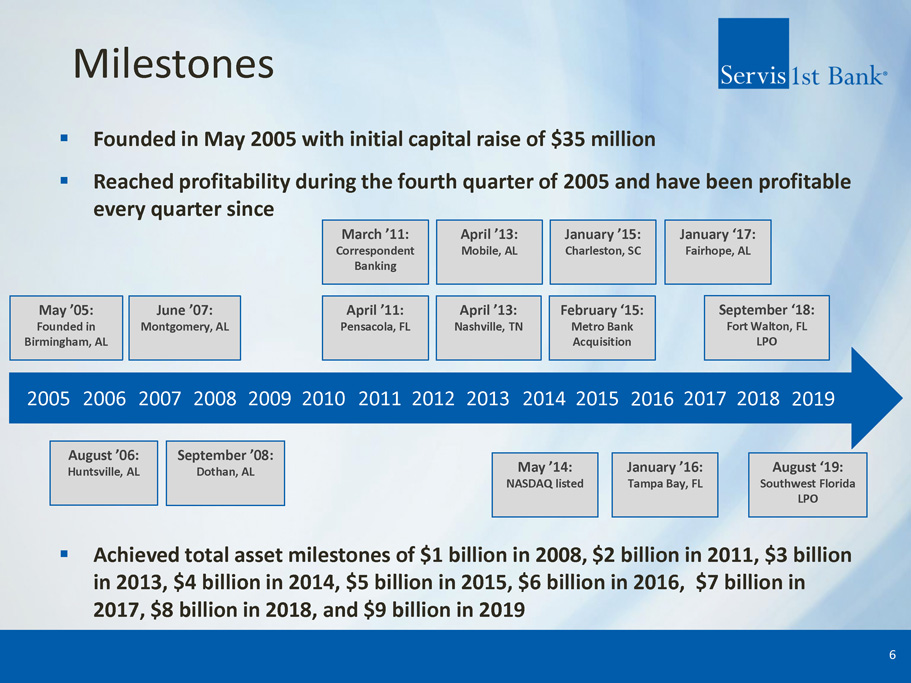 Opportunistic Expansion ▪ Identify great bankers in attractive markets – Focus on people as opposed to places – Target minimum of $300 million in assets within 3 years – Best bankers in growing markets ▪ Market strategies – Regional CEOs execute simple business model – Back office support and risk management infrastructure – Non - legal board of directors comprised of key business people – Provide professional banking services to mid - market commercial customers that have been neglected or pushed down to branch personnel by national and other larger regional banks ▪ Opportunistic future expansion – Southern markets, metropolitan focus – Draw on expertise of industry contacts 5