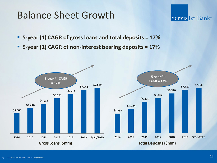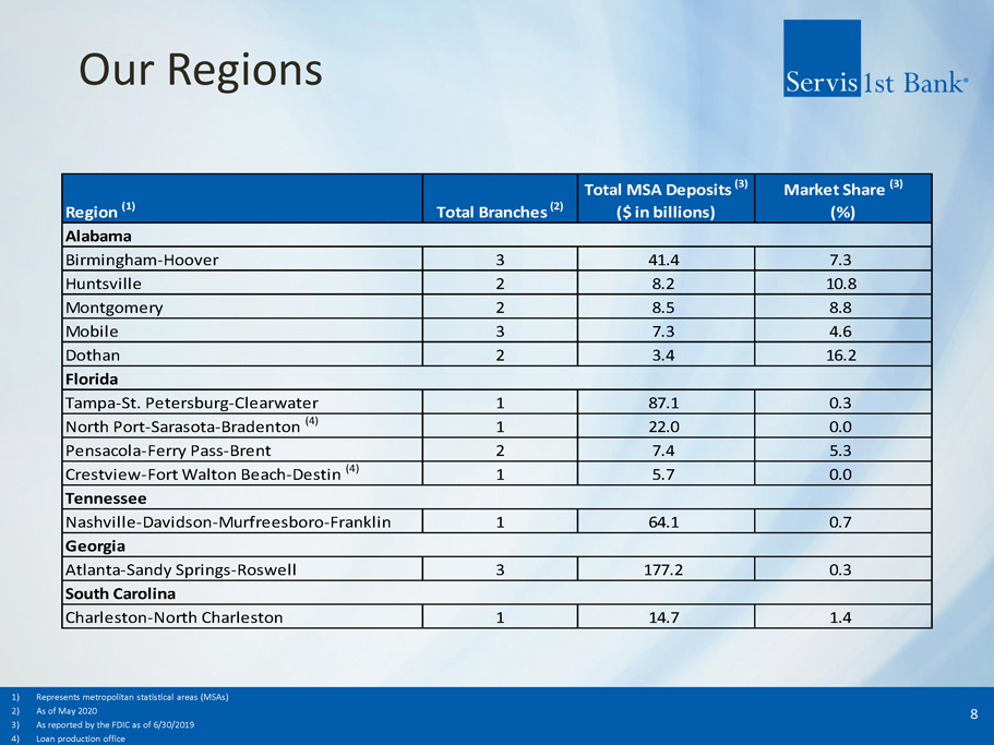 ServisFirst at a Glance Overview ▪ Founded in 2005 in Birmingham, AL ▪ Single bank BHC High - Performing Metropolitan Commercial Bank ▪ Total Assets (1) : $9.4 billion ▪ Stockholders’ Equity (1) : $882 million High Growth Coupled with Pristine Credit Metrics (3) ▪ Gross Loans CAGR: 17% ▪ Total Deposits CAGR: 17% ▪ Net Income for Common CAGR: 23% ▪ Diluted EPS CAGR: 21% ▪ ROAA (2) : 1.54% ▪ Efficiency Ratio (2) : 33.11% 1) As of March 31, 2020 2) For three months ended March 31, 2020 3) 5 - year compounded annual growth rate calculated from December 31, 2014 to December 31, 2019 ▪ NPAs / assets (1) : 0.44% ▪ NPLs / loans (1) : 0.45% 3