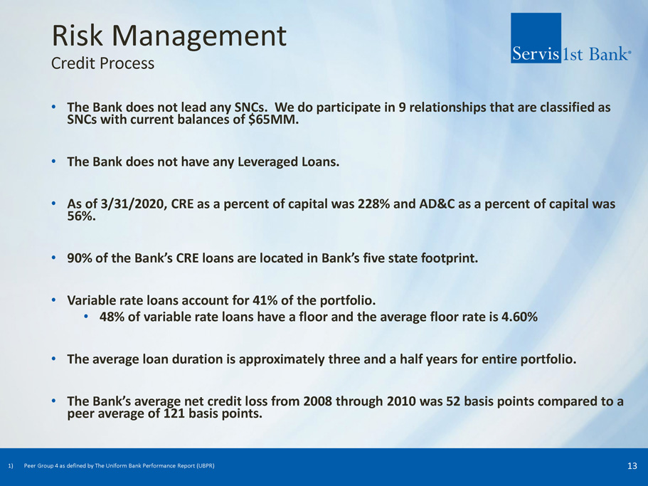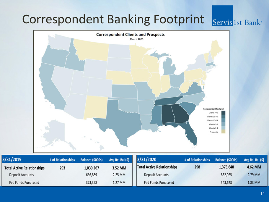 Risk Management Credit Process • The Bank does not lead any SNCs. We do participate in 9 relationships that are classified as SNCs with current balances of $65MM. • The Bank does not have any Leveraged Loans. • As of 3/31/2020, CRE as a percent of capital was 228% and AD&C as a percent of capital was 56%. • 90% of the Bank’s CRE loans are located in Bank’s five state footprint. • Variable rate loans account for 41% of the portfolio. • 48% of variable rate loans have a floor and the average floor rate is 4.60% • The average loan duration is approximately three and a half years for entire portfolio. • The Bank’s average net credit loss from 2008 through 2010 was 52 basis points compared to a peer average of 121 basis points. 13 1) Peer Group 4 as defined by The Uniform Bank Performance Report (UBPR)