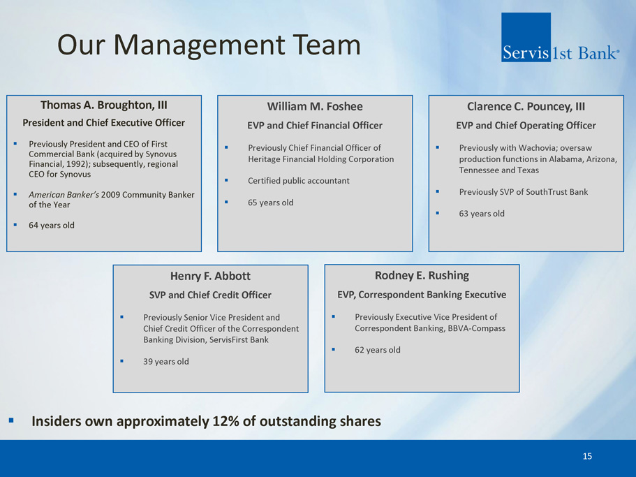 Our Management Team Thomas A. Broughton, III President and Chief Executive Officer ▪ Previously President and CEO of First Commercial Bank (acquired by Synovus Financial, 1992); subsequently, regional CEO for Synovus ▪ American Banker’s 2009 Community Banker of the Year ▪ 64 years old 15 William M. Foshee EVP and Chief Financial Officer ▪ Previously Chief Financial Officer of Heritage Financial Holding Corporation ▪ Certified public accountant ▪ 65 years old Clarence C. Pouncey , III EVP and Chief Operating Officer ▪ Previously with Wachovia; oversaw production functions in Alabama, Arizona, Tennessee and Texas ▪ Previously SVP of SouthTrust Bank ▪ 63 years old Henry F. Abbott SVP and Chief Credit Officer ▪ Previously Senior Vice President and Chief Credit Officer of the Correspondent Banking Division, ServisFirst Bank ▪ 39 years old Rodney E. Rushing EVP, Correspondent Banking Executive ▪ Previously Executive Vice President of Correspondent Banking, BBVA - Compass ▪ 62 years old ▪ Insiders own approximately 12% of outstanding shares
