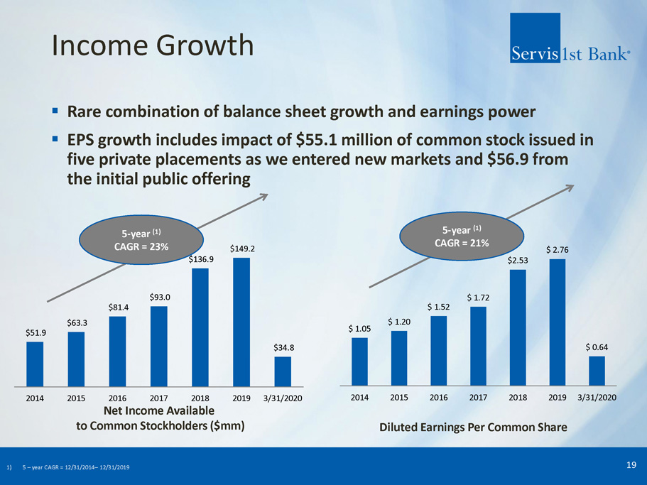 $3,398 $4,224 $5,420 $6,092 $6,916 $7,530 $7,833 2014 2015 2016 2017 2018 2019 3/31/2020 Balance Sheet Growth ▪ 5 - year (1) CAGR of gross loans and total deposits = 17% ▪ 5 - year (1) CAGR of non - interest bearing deposits = 17% 18 5 - year (1) CAGR = 17% 5 - year (1) CAGR = 17% Gross Loans ($mm) Total Deposits ($mm) $3,360 $4,216 $4,912 $5,851 $6,533 $7,261 $7,569 2014 2015 2016 2017 2018 2019 3/31/2020 1) 5 – year CAGR = 12/31/2014 – 12/31/2019
