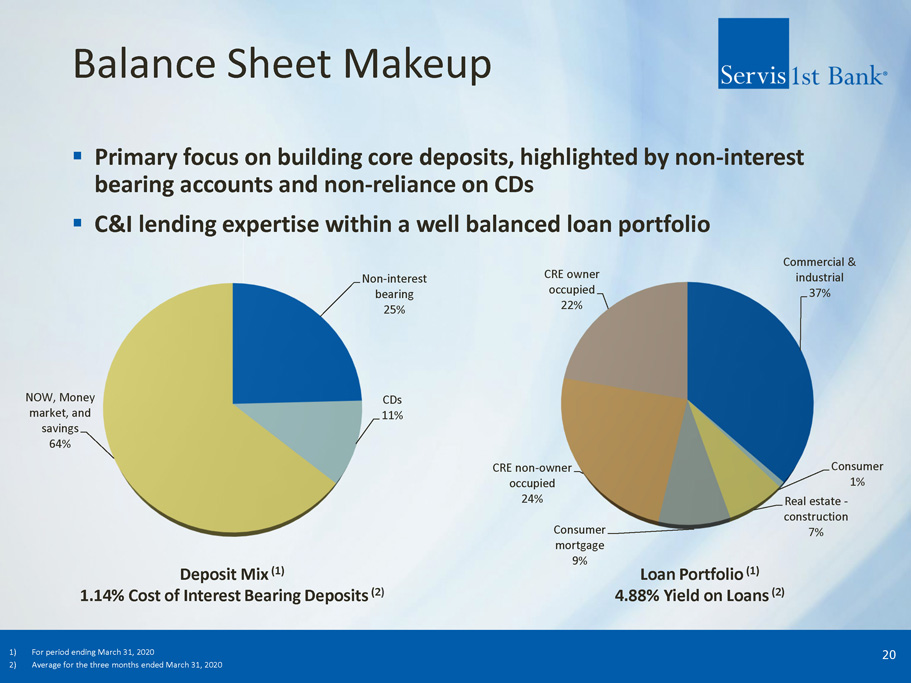 $ 1.05 $ 1.20 $ 1.52 $ 1.72 $ 2.53 $ 2.76 $ 0.64 2014 2015 2016 2017 2018 2019 3/31/2020 $51.9 $63.3 $81.4 $93.0 $136.9 $149.2 $34.8 2014 2015 2016 2017 2018 2019 3/31/2020 Income Growth ▪ Rare combination of balance sheet growth and earnings power ▪ EPS growth includes impact of $55.1 million of common stock issued in five private placements as we entered new markets and $56.9 from the initial public offering 19 5 - year (1) CAGR = 23% 5 - year (1) CAGR = 21% Net Income Available to Common Stockholders ($mm) Diluted Earnings Per Common Share 1) 5 – year CAGR = 12/31/2014 – 12/31/2019