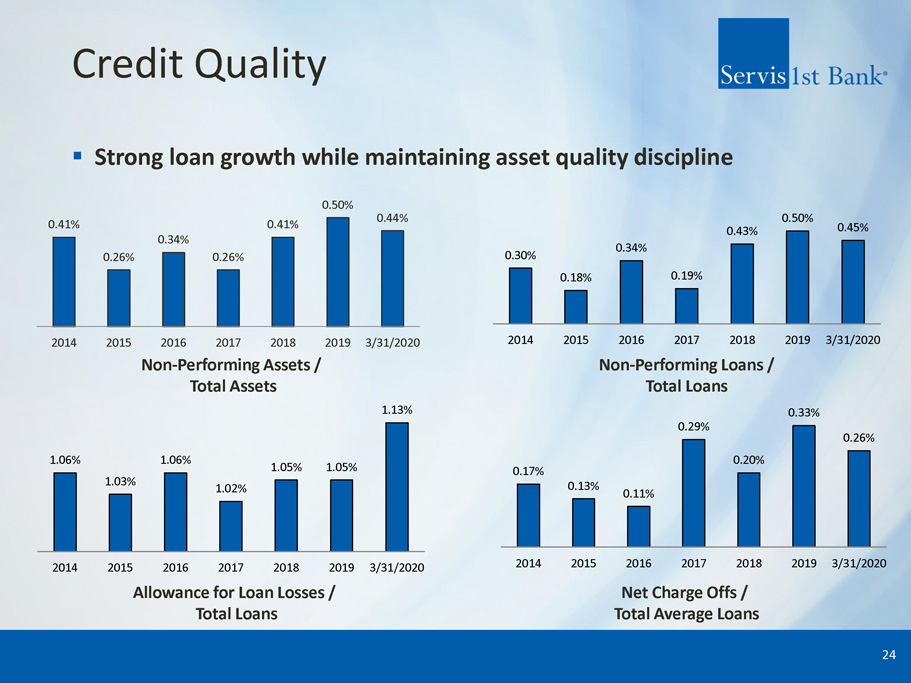 Credit Trends (In Thousands) 2014 2015 2016 2017 2018 2019 3/31/2020 1-4 Family Construction Speculative 13,608$ 25,794$ 27,835$ 31,230$ 34,594$ 47,809$ 63,594$ 1-4 Family Construction Sold 28,124$ 29,086$ 45,051$ 47,441$ 46,467$ 56,105$ 40,257$ Resi Acquisition & Development 20,009$ 18,693$ 17,681$ 40,956$ 24,542$ 37,219$ 42,917$ Multifamily Permanent 54,725$ 71,217$ 92,052$ 127,502$ 160,981$ 300,281$ 296,868$ Residential Lot Loans 25,630$ 27,844$ 23,138$ 20,059$ 26,222$ 26,486$ 28,520$ Commercial Lots 16,007$ 17,986$ 25,618$ 31,601$ 43,610$ 50,198$ 49,960$ Raw Land 30,124$ 60,360$ 37,228$ 44,145$ 50,111$ 45,193$ 47,905$ Commercial Construction 76,904$ 72,807$ 158,537$ 365,442$ 307,645$ 254,983$ 274,127$ Other CRE Income Property 341,262$ 517,416$ 640,793$ 748,630$ 1,045,233$ 1,333,276$ 1,431,386$ Total CRE (Excluding O/O CRE) 606,394$ 841,203$ 1,067,930$ 1,457,006$ 1,739,405$ 2,151,550$ 2,275,535$ Total Risk-Based Capital (Bank Level) 458,073$ 530,688$ 616,415$ 718,151$ 838,216$ 962,616$ 999,273$ CRE as % of Total Capital 132% 159% 173% 203% 208% 224% 228% Total Gross Loans 3,359,858$ 4,216,375$ 4,911,770$ 5,851,261$ 6,533,499$ 7,261,451$ 7,568,836$ CRE as % of Total Portfolio 18% 20% 22% 25% 27% 30% 30% CRE Owner Occupied 793,917$ 1,014,669$ 1,171,719$ 1,328,666$ 1,463,887$ 1,588,148$ 1,594,491$ CRE OO as % of Total Portfolio 24% 24% 24% 23% 22% 22% 21% CRE OO as % of Total Capital 173% 191% 190% 185% 175% 165% 160% AD&C 208,769$ 243,267$ 335,085$ 580,874$ 533,191$ 517,992$ 556,967$ AD&C as % of Total Capital 46% 46% 54% 81% 64% 54% 56% AD&C as % of Total Portfolio 6% 6% 7% 10% 8% 7% 7% Commercial Real Estate Trends Acquisition, Development, & Construction Trends Year Ended December 31, 23