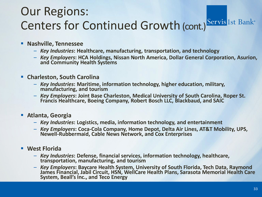 Our Regions: Centers for Continued Growth (cont.) ▪ Dothan, Alabama – Key Industries : Agriculture, manufacturing, and healthcare services – Key Employers : Southeast Alabama Medical Center, Wayne Farms, Southern Nuclear, Michelin Tire, Pemco World Air Services, Globe Motors, and AAA Cooper Transportation ▪ Pensacola, Florida – Key Industries : Military, health services, medical technology industries, and tourism – Key Employers : Eglin Air Force Base, Hurlburt Field, Pensacola Whiting Field, Pensacola Naval Air Station and Corry Station, Sacred Heart Health System, West Florida Regional Hospital, Gulf Power Company, University of West Florida, Solutia, and GE Wind Energy ▪ Mobile, Alabama – Key Industries : Aircraft assembly, aerospace, steel, ship building, maritime, construction, medicine, and manufacturing – Key Employers : Port of Mobile, Infirmary Health Systems, Austal USA, Brookley Aeroplex , ThyssenKrupp, Infirmary Health Systems, University of South Alabama, ST Aerospace Mobile, and EADS 32