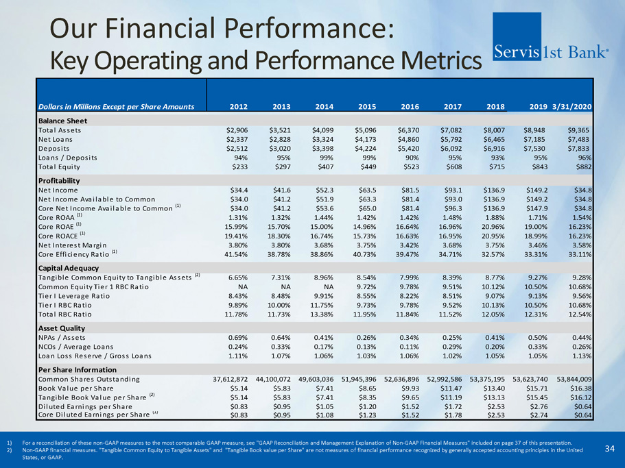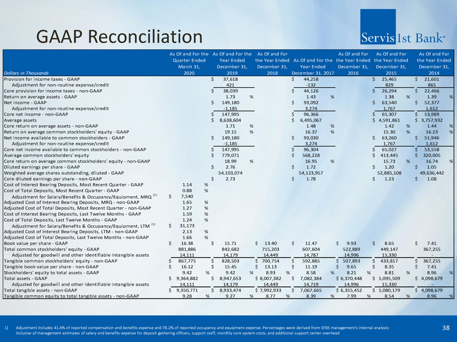 GAAP Reconciliation 38 1) Adjustment includes 41 . 4 % of reported compensation and benefits expense and 78 . 2 % of reported occupancy and equipment expense . Percentages were derived from SFBS management’s internal analysis ; inclusive of management estimates of salary and benefits expense for deposit gathering officers, support staff, monthly core system costs, and additional support center overhead Dollars in Thousands Provision for income taxes - GAAP $ 37,618 $ 44,258 $ 25,465 $ 21,601 Adjustment for non-routine expense/credit 421 -132 829 865 Core provision for income taxes - non-GAAP $ 38,039 $ 44,126 $ 26,294 $ 22,466 Return on average assets - GAAP 1.73 % 1.43 % 1.38 % 1.39 % Net income - GAAP $ 149,180 $ 93,092 $ 63,540 $ 52,377 Adjustment for non-routine expense/credit -1,185 3,274 1,767 1,612 Core net income - non-GAAP $ 147,995 $ 96,366 $ 65,307 $ 53,989 Average assets $ 8,638,604 $ 6,495,067 $ 4,591,861 $ 3,757,932 Core return on average assets - non-GAAP 1.71 % 1.48 % 1.42 % 1.44 % Return on average common stockholders' equity - GAAP 19.15 % 16.37 % 15.30 % 16.23 % Net income available to common stockholders - GAAP $ 149,180 $ 93,030 $ 63,260 $ 51,946 Adjustment for non-routine expense/credit -1,185 3,274 1,767 1,612 Core net income available to common stockholders - non-GAAP $ 147,995 $ 96,304 $ 65,027 $ 53,558 Average common stockholders' equity $ 779,071 $ 568,228 $ 413,445 $ 320,005 Core return on average common stockholders' equity - non-GAAP 18.99 % 16.95 % 15.73 % 16.74 % Diluted earnings per share - GAAP $ 2.76 $ 1.72 $ 1.20 $ 1.05 Weighted average shares outstanding, diluted - GAAP 54,103,074 54,123,957 52,885,108 49,636,442 Core diluted earnings per share - non-GAAP $ 2.73 $ 1.78 $ 1.23 $ 1.08 Cost of Interest Bearing Deposits, Most Recent Quarter - GAAP 1.14 % Cost of Total Deposits, Most Recent Quarter - GAAP 0.88 % Adjustment for Salary/Benefits & Occupancy/Equipment, MRQ (1) $ 7,540 Adjusted Cost of Interest Bearing Deposits, MRQ - non-GAAP 1.65 % Adjusted Cost of Total Deposits, Most Recent Quarter - non-GAAP 1.27 % Cost of Interest Bearing Deposits, Last Twelve Months - GAAP 1.59 % Cost of Total Deposits, Last Twelve Months - GAAP 1.24 % Adjustment for Salary/Benefits & Occupancy/Equipment, LTM (1) $ 31,173 Adjusted Cost of Interest Bearing Deposits, LTM - non-GAAP 2.13 % Adjusted Cost of Total Deposits, Last Twelve Months - non-GAAP 1.66 % Book value per share - GAAP $ 16.38 $ 15.71 $ 13.40 $ 11.47 $ 9.93 $ 8.65 $ 7.41 Total common stockholders' equity - GAAP 881,886 842,682 715,203 607,604 522,889 449,147 367,255 Adjusted for goodwill and other identifiable intangible assets 14,111 14,179 14,449 14,787 14,996 15,330 - Tangible common stockholders' equity - non-GAAP $ 867,775 $ 828,503 $ 700,754 $ 592,885 $ 507,893 $ 433,817 $ 367,255 Tangible book value per share - non-GAAP $ 16.12 $ 15.45 $ 13.13 $ 11.19 $ 9.65 $ 8.35 $ 7.41 Stockholders' equity to total assets - GAAP 9.42 % 9.42 % 8.93 % 8.58 % 8.21 % 8.81 % 8.96 % Total assets - GAAP $ 9,364,882 $ 8,947,653 $8,007,382 $ 7,082,384 $6,370,448 $ 5,095,509 $ 4,098,679 Adjusted for goodwill and other identifiable intangible assets 14,111 14,179 14,449 14,719 14,996 15,330 - Total tangible assets - non-GAAP $ 9,350,771 $ 8,933,474 $7,992,933 $ 7,067,665 $6,355,452 $ 5,080,179 $ 4,098,679 Tangible common equity to total tangible assets - non-GAAP 9.28 % 9.27 % 8.77 % 8.39 % 7.99 % 8.54 % 8.96 % As Of and For the Quarter Ended March 31, 2020 As Of and For the Year Ended December 31, 2019 As Of and For the Year Ended December 31, 2014 As Of and For the Year Ended December 31, 2015 As Of and For the Year Ended December 31, 2016 As Of and For the Year Ended December 31, 2017 As Of and For the Year Ended December 31, 2018