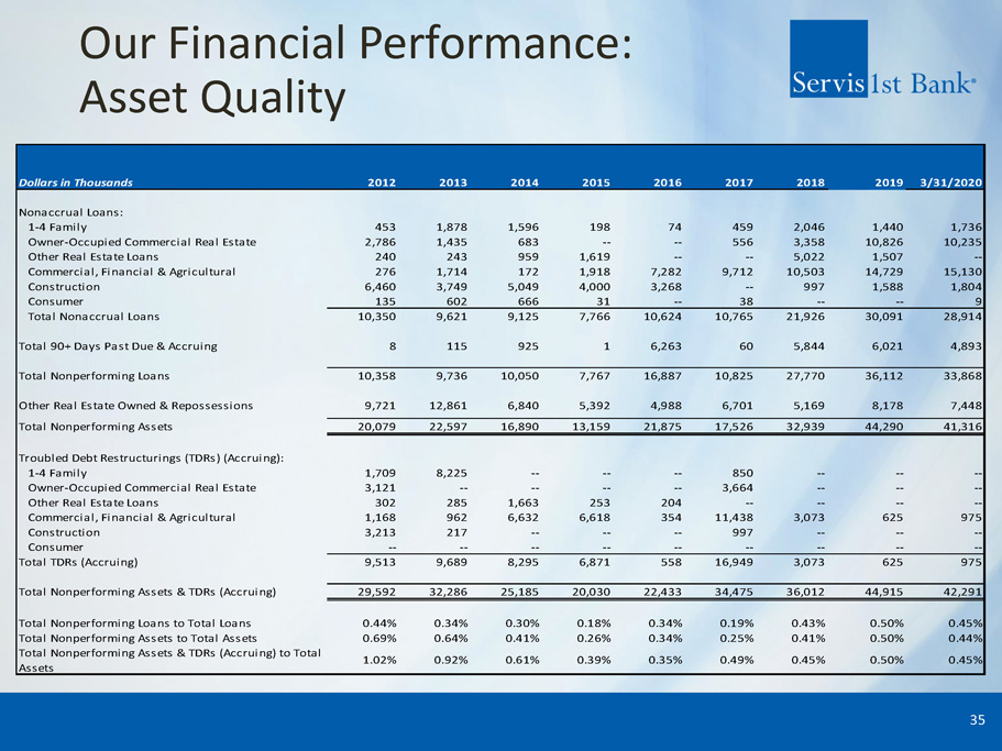 Our Financial Performance: Key Operating and Performance Metrics 34 2012 2013 2014 2015 2016 2017 2018 20193/31/2020 Balance Sheet Total Assets $2,906 $3,521 $4,099 $5,096 $6,370 $7,082 $8,007 $8,948 $9,365 Net Loans $2,337 $2,828 $3,324 $4,173 $4,860 $5,792 $6,465 $7,185 $7,483 Deposits $2,512 $3,020 $3,398 $4,224 $5,420 $6,092 $6,916 $7,530 $7,833 Loans / Deposits 94% 95% 99% 99% 90% 95% 93% 95% 96% Total Equity $233 $297 $407 $449 $523 $608 $715 $843 $882 Profitability Net Income $34.4 $41.6 $52.3 $63.5 $81.5 $93.1 $136.9 $149.2 $34.8 Net Income Available to Common $34.0 $41.2 $51.9 $63.3 $81.4 $93.0 $136.9 $149.2 $34.8 Core Net Income Available to Common (1) $34.0 $41.2 $53.6 $65.0 $81.4 $96.3 $136.9 $147.9 $34.8 Core ROAA (1) 1.31% 1.32% 1.44% 1.42% 1.42% 1.48% 1.88% 1.71% 1.54% Core ROAE (1) 15.99% 15.70% 15.00% 14.96% 16.64% 16.96% 20.96% 19.00% 16.23% Core ROACE (1) 19.41% 18.30% 16.74% 15.73% 16.63% 16.95% 20.95% 18.99% 16.23% Net Interest Margin 3.80% 3.80% 3.68% 3.75% 3.42% 3.68% 3.75% 3.46% 3.58% Core Efficiency Ratio (1) 41.54% 38.78% 38.86% 40.73% 39.47% 34.71% 32.57% 33.31% 33.11% Capital Adequacy Tangible Common Equity to Tangible Assets (2) 6.65% 7.31% 8.96% 8.54% 7.99% 8.39% 8.77% 9.27% 9.28% Common Equity Tier 1 RBC Ratio NA NA NA 9.72% 9.78% 9.51% 10.12% 10.50% 10.68% Tier I Leverage Ratio 8.43% 8.48% 9.91% 8.55% 8.22% 8.51% 9.07% 9.13% 9.56% Tier I RBC Ratio 9.89% 10.00% 11.75% 9.73% 9.78% 9.52% 10.13% 10.50% 10.68% Total RBC Ratio 11.78% 11.73% 13.38% 11.95% 11.84% 11.52% 12.05% 12.31% 12.54% Asset Quality NPAs / Assets 0.69% 0.64% 0.41% 0.26% 0.34% 0.25% 0.41% 0.50% 0.44% NCOs / Average Loans 0.24% 0.33% 0.17% 0.13% 0.11% 0.29% 0.20% 0.33% 0.26% Loan Loss Reserve / Gross Loans 1.11% 1.07% 1.06% 1.03% 1.06% 1.02% 1.05% 1.05% 1.13% Per Share Information Common Shares Outstanding 37,612,872 44,100,072 49,603,036 51,945,396 52,636,896 52,992,586 53,375,195 53,623,740 53,844,009 Book Value per Share $5.14 $5.83 $7.41 $8.65 $9.93 $11.47 $13.40 $15.71 $16.38 Tangible Book Value per Share (2) $5.14 $5.83 $7.41 $8.35 $9.65 $11.19 $13.13 $15.45 $16.12 Diluted Earnings per Share $0.83 $0.95 $1.05 $1.20 $1.52 $1.72 $2.53 $2.76 $0.64 Core Diluted Earnings per Share (1) $0.83 $0.95 $1.08 $1.23 $1.52 $1.78 $2.53 $2.74 $0.64 Dollars in Millions Except per Share Amounts 1) For a reconciliation of these non - GAAP measures to the most comparable GAAP measure, see "GAAP Reconciliation and Management Exp lanation of Non - GAAP Financial Measures" included on page 37 of this presentation. 2) Non - GAAP financial measures. "Tangible Common Equity to Tangible Assets" and "Tangible Book value per Share" are not measures o f financial performance recognized by generally accepted accounting principles in the United States, or GAAP.
