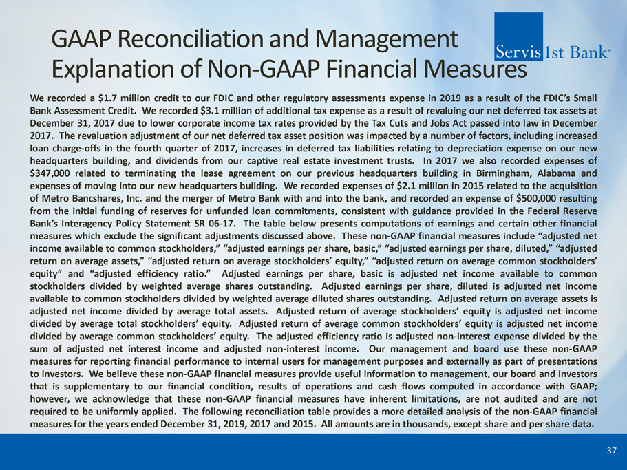 GAAP Reconciliation and Management Explanation of Non - GAAP Financial Measures We recorded a $ 1 . 7 million credit to our FDIC and other regulatory assessments expense in 2019 as a result of the FDIC’s Small Bank Assessment Credit . We recorded $ 3 . 1 million of additional tax expense as a result of revaluing our net deferred tax assets at December 31 , 2017 due to lower corporate income tax rates provided by the Tax Cuts and Jobs Act passed into law in December 2017 . The revaluation adjustment of our net deferred tax asset position was impacted by a number of factors, including increased loan charge - offs in the fourth quarter of 2017 , increases in deferred tax liabilities relating to depreciation expense on our new headquarters building, and dividends from our captive real estate investment trusts . In 2017 we also recorded expenses of $ 347 , 000 related to terminating the lease agreement on our previous headquarters building in Birmingham, Alabama and expenses of moving into our new headquarters building . We recorded expenses of $ 2 . 1 million in 2015 related to the acquisition of Metro Bancshares, Inc . and the merger of Metro Bank with and into the bank, and recorded an expense of $ 500 , 000 resulting from the initial funding of reserves for unfunded loan commitments, consistent with guidance provided in the Federal Reserve Bank’s Interagency Policy Statement SR 06 - 17 . The table below presents computations of earnings and certain other financial measures which exclude the significant adjustments discussed above . These non - GAAP financial measures include “adjusted net income available to common stockholders,” “adjusted earnings per share, basic,” “adjusted earnings per share, diluted,” “adjusted return on average assets,” “adjusted return on average stockholders’ equity,” “adjusted return on average common stockholders’ equity” and “adjusted efficiency ratio . ” Adjusted earnings per share, basic is adjusted net income available to common stockholders divided by weighted average shares outstanding . Adjusted earnings per share, diluted is adjusted net income available to common stockholders divided by weighted average diluted shares outstanding . Adjusted return on average assets is adjusted net income divided by average total assets . Adjusted return of average stockholders’ equity is adjusted net income divided by average total stockholders’ equity . Adjusted return of average common stockholders’ equity is adjusted net income divided by average common stockholders’ equity . The adjusted efficiency ratio is adjusted non - interest expense divided by the sum of adjusted net interest income and adjusted non - interest income . Our management and board use these non - GAAP measures for reporting financial performance to internal users for management purposes and externally as part of presentations to investors . We believe these non - GAAP financial measures provide useful information to management, our board and investors that is supplementary to our financial condition, results of operations and cash flows computed in accordance with GAAP ; however, we acknowledge that these non - GAAP financial measures have inherent limitations, are not audited and are not required to be uniformly applied . The following reconciliation table provides a more detailed analysis of the non - GAAP financial measures for the years ended December 31 , 2019 , 2017 and 2015 . All amounts are in thousands, except share and per share data . 37