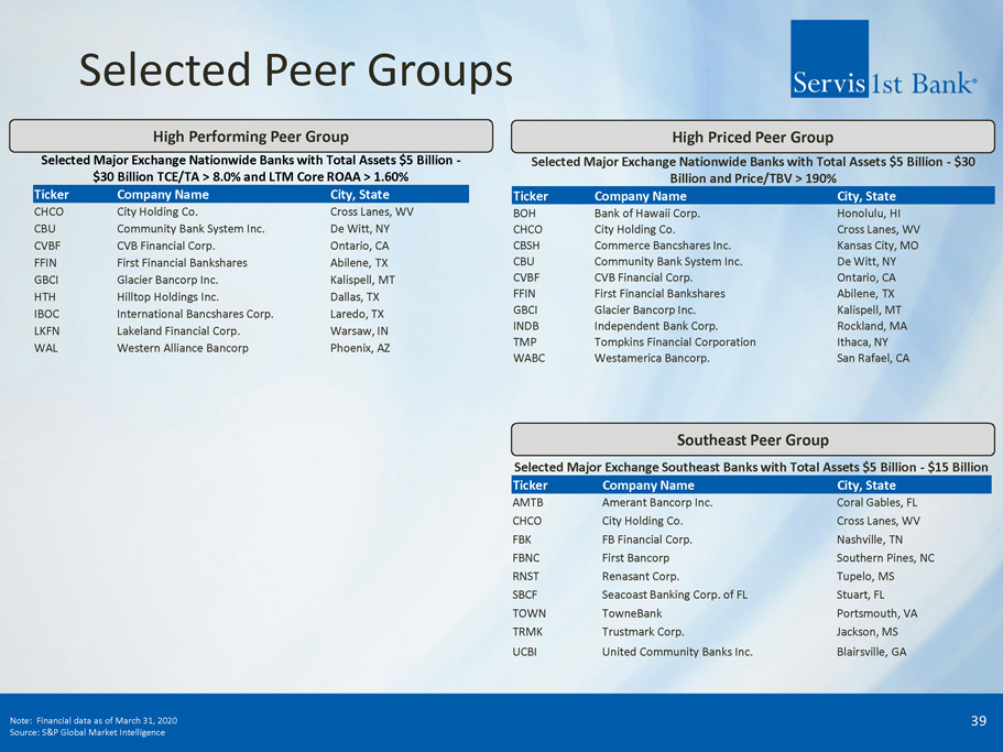 Selected Peer Groups Southeast Peer Group High Performing Peer Group High Priced Peer Group Selected Major Exchange Nationwide Banks with Total Assets $5 Billion - $30 Billion and Price/TBV > 190% Ticker Company Name City, State BOH Bank of Hawaii Corp. Honolulu, HI CHCO City Holding Co. Cross Lanes, WV CBSH Commerce Bancshares Inc. Kansas City, MO CBU Community Bank System Inc. De Witt, NY CVBF CVB Financial Corp. Ontario, CA FFIN First Financial Bankshares Abilene, TX GBCI Glacier Bancorp Inc. Kalispell, MT INDB Independent Bank Corp. Rockland, MA TMP Tompkins Financial Corporation Ithaca, NY WABC Westamerica Bancorp. San Rafael, CA Selected Major Exchange Nationwide Banks with Total Assets $5 Billion - $30 Billion TCE/TA > 8.0% and LTM Core ROAA > 1.60% Ticker Company Name City, State CHCO City Holding Co. Cross Lanes, WV CBU Community Bank System Inc. De Witt, NY CVBF CVB Financial Corp. Ontario, CA FFIN First Financial Bankshares Abilene, TX GBCI Glacier Bancorp Inc. Kalispell, MT HTH Hilltop Holdings Inc. Dallas, TX IBOC International Bancshares Corp. Laredo, TX LKFN Lakeland Financial Corp. Warsaw, IN WAL Western Alliance Bancorp Phoenix, AZ Selected Major Exchange Southeast Banks with Total Assets $5 Billion - $15 Billion Ticker Company Name City, State AMTB Amerant Bancorp Inc. Coral Gables, FL CHCO City Holding Co. Cross Lanes, WV FBK FB Financial Corp. Nashville, TN FBNC First Bancorp Southern Pines, NC RNST Renasant Corp. Tupelo, MS SBCF Seacoast Banking Corp. of FL Stuart, FL TOWN TowneBank Portsmouth, VA TRMK Trustmark Corp. Jackson, MS UCBI United Community Banks Inc. Blairsville, GA Note: Financial data as of March 31, 2020 Source: S&P Global Market Intelligence 39