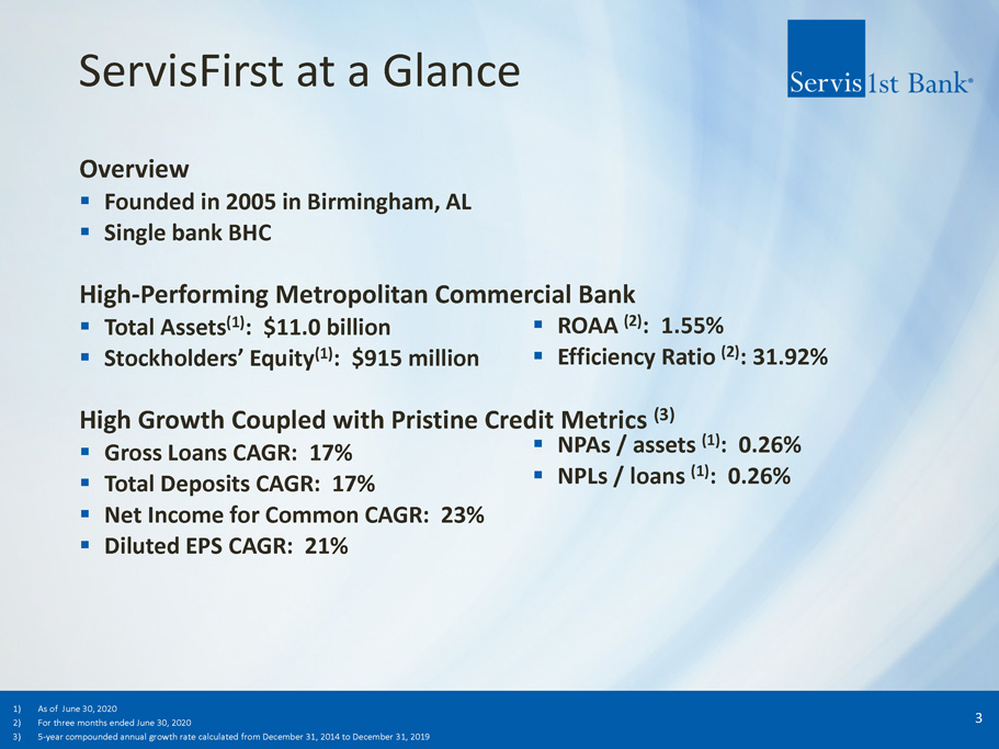 Forward - Looking Statements This presentation contains forward - looking statements within the meaning of the Private Securities Litigation Reform Act of 1995 . In addition, ServisFirst Bancshares, Inc . may file or furnish documents with the Securities and Exchange Commission which contain forward - looking statements and management may make forward - looking statements orally to analysts, investors, representatives of the media and others . These statements are based on the current beliefs and expectations of ServisFirst Bancshares, Inc . ’s management and are subject to significant risks and uncertainties . Actual results may differ from those set forth in the forward - looking statements . Factors that could cause ServisFirst Bancshares, Inc . ’s actual results to differ materially from those described in the forward - looking statements can be found in ServisFirst Bancshares, Inc . ’s Annual Report on Form 10 - K for the year ended December 31 , 2019 , and Quarterly Reports on Form 10 - Q for the quarters ended June 30 , 2020 , March 31 , 2020 , and September 30 , 2019 which have been filed with the Securities and Exchange Commission and which are available on ServisFirst Bancshares, Inc . ’s website ( www . servisfirstbank . com ) and on the Securities and Exchange Commission’s website ( www . sec . gov ) . ServisFirst Bancshares, Inc . does not undertake to update the forward - looking statements to reflect the impact of circumstances or events that may arise after the date of the forward - looking statements . ▪ Non - GAAP Financial Measures This presentation includes non - GAAP financial measures. Information about any such non - GAAP financial measures, including a reconciliation of those measures to GAAP, can be found in the presentation. 2