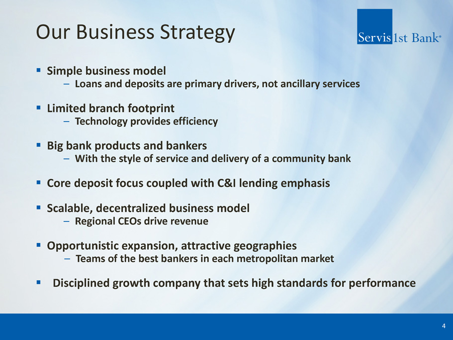 ServisFirst at a Glance Overview ▪ Founded in 2005 in Birmingham, AL ▪ Single bank BHC High - Performing Metropolitan Commercial Bank ▪ Total Assets (1) : $11.0 billion ▪ Stockholders’ Equity (1) : $915 million High Growth Coupled with Pristine Credit Metrics (3) ▪ Gross Loans CAGR: 17% ▪ Total Deposits CAGR: 17% ▪ Net Income for Common CAGR: 23% ▪ Diluted EPS CAGR: 21% ▪ ROAA (2) : 1.55% ▪ Efficiency Ratio (2) : 31.92% 1) As of June 30, 2020 2) For three months ended June 30, 2020 3) 5 - year compounded annual growth rate calculated from December 31, 2014 to December 31, 2019 ▪ NPAs / assets (1) : 0.26% ▪ NPLs / loans (1) : 0.26% 3