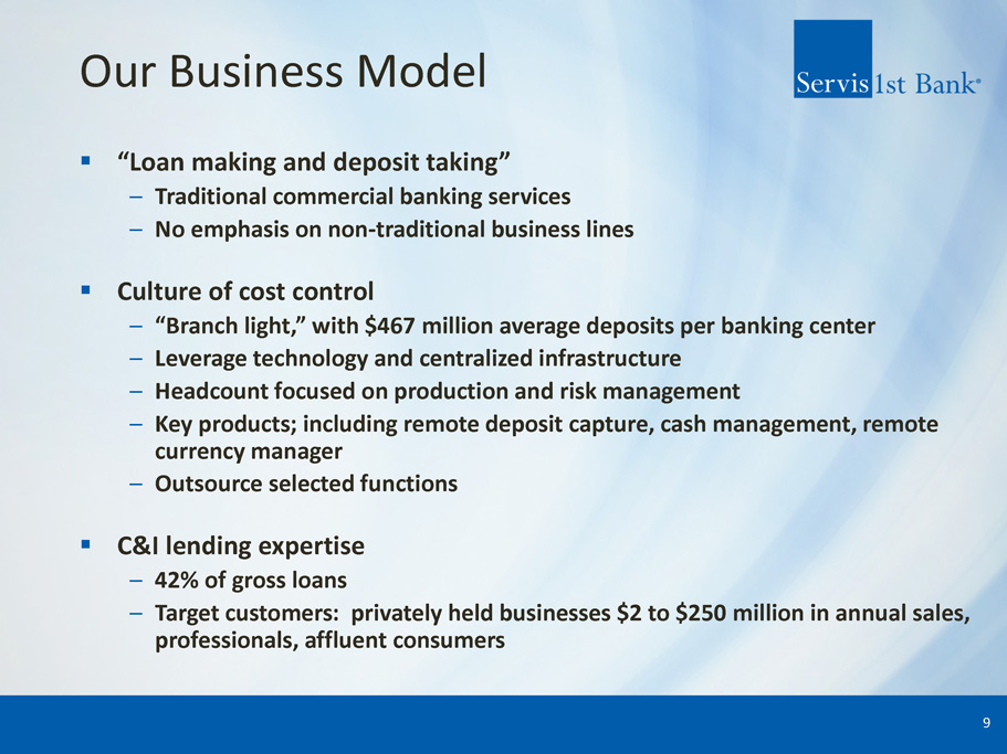 Our Regions 8 Total Offices (2) Total MSA Deposits (3) ($ in billions) Market Share (3) (%) 3 41.4 7.3 2 8.2 10.8 2 8.5 8.8 3 7.3 4.6 2 3.4 16.2 1 87.1 0.3 North Port-Sarasota-Bradenton (4) 1 22.0 0.0 2 7.4 5.3 Crestview-Fort Walton Beach-Destin 1 5.7 0.0 1 64.1 0.7 Atlanta-Sandy Springs-Roswell 3 177.2 0.3 Columbus (4) 1 9.4 0.0 Charleston-North Charleston 2 14.7 1.4 24 456.4 Region (1) Birmingham-Hoover Huntsville Pensacola-Ferry Pass-Brent Alabama Florida Montgomery Dothan Mobile Tampa-St. Petersburg-Clearwater Tennessee Georgia South Carolina Total Nashville-Davidson-Murfreesboro-Franklin 1) Represents metropolitan statistical areas (MSAs) 2) As of September 2020 3) As reported by the FDIC as of 6/30/2019 4) Loan production office