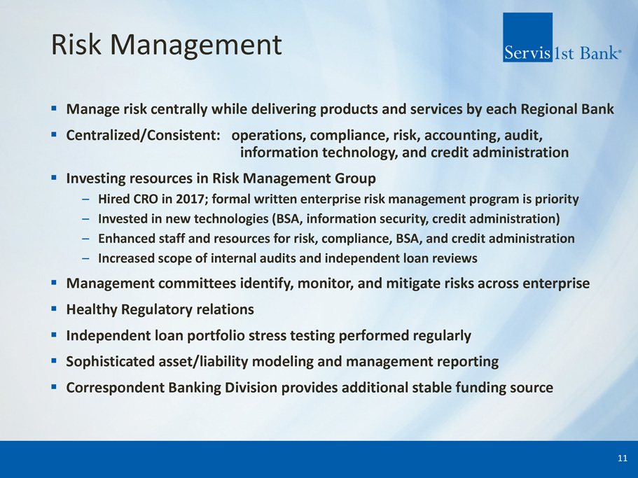 Scalable, Decentralized Structure ▪ Local decision - making – Emphasize local decision - making to drive customer revenue – Centralized, uniform risk management and support – Conservative local lending authorities, covers most lending decisions – Geographic organizational structure (as opposed to line of business structure) ▪ Regional CEOs empowered and held accountable – Utilize stock based compensation to align goals ▪ Top - down sales culture – Senior management actively involved in customer acquisition 10