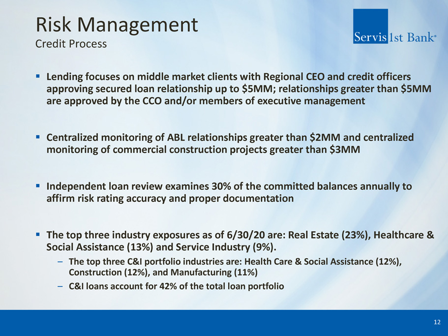 Risk Management ▪ Manage risk centrally while delivering products and services by each Regional Bank ▪ Centralized/Consistent: operations, compliance, risk, accounting, audit, information technology, and credit administration ▪ Investing resources in Risk Management Group – Hired CRO in 2017; formal written enterprise risk management program is priority – Invested in new technologies (BSA, information security, credit administration) – Enhanced staff and resources for risk, compliance, BSA, and credit administration – Increased scope of internal audits and independent loan reviews ▪ Management committees identify, monitor, and mitigate risks across enterprise ▪ Healthy Regulatory relations ▪ Independent loan portfolio stress testing performed regularly ▪ Sophisticated asset/liability modeling and management reporting ▪ Correspondent Banking Division provides additional stable funding source 11