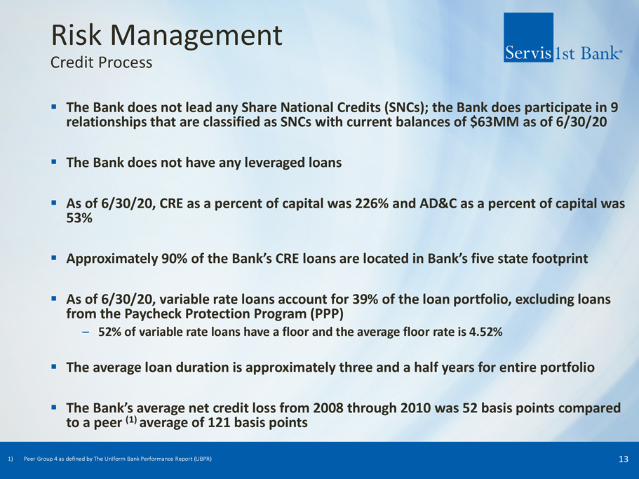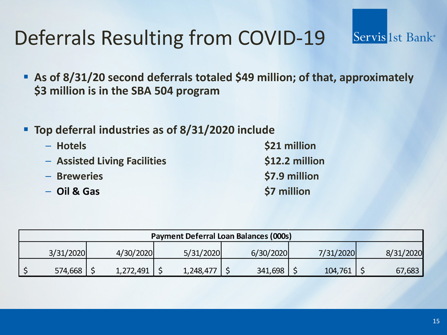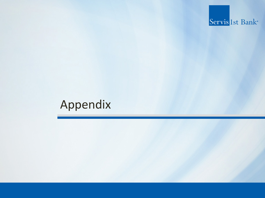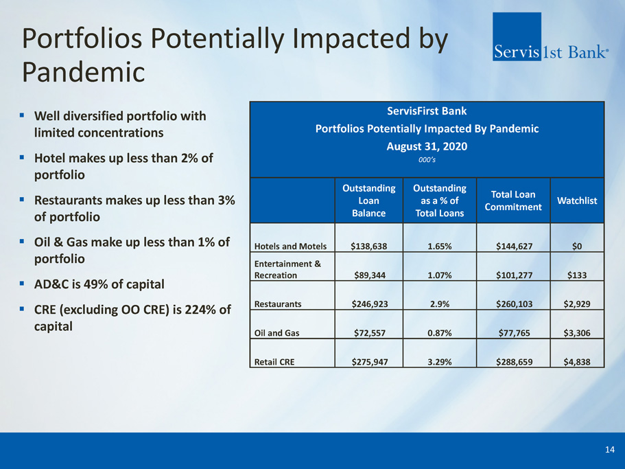 Portfolios Potentially Impacted by Pandemic ▪ Well diversified portfolio with limited concentrations ▪ Hotel makes up less than 2% of portfolio ▪ Restaurants makes up less than 3% of portfolio ▪ Oil & Gas make up less than 1% of portfolio ▪ AD&C is 49% of capital ▪ CRE (excluding OO CRE) is 224% of capital ServisFirst Bank Portfolios Potentially Impacted By Pandemic August 31, 2020 000’s Outstanding Loan Balance Outstanding as a % of Total Loans Total Loan Commitment Watchlist Hotels and Motels $138,638 1.65% $144,627 $0 Entertainment & Recreation $89,344 1.07% $101,277 $133 Restaurants $246,923 2.9% $260,103 $2,929 Oil and Gas $72,557 0.87% $77,765 $3,306 Retail CRE $275,947 3.29% $288,659 $4,838 14