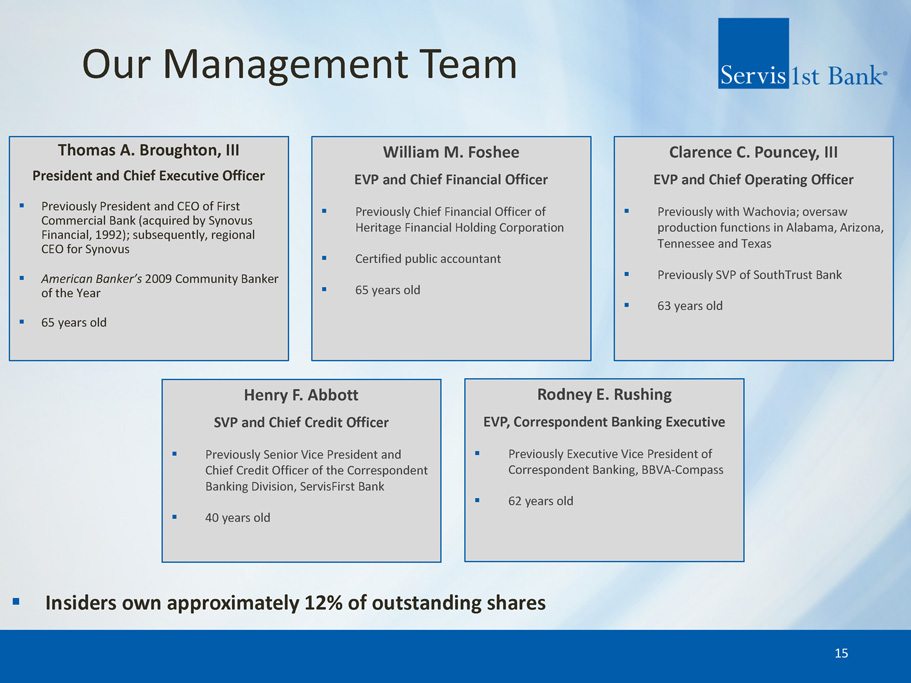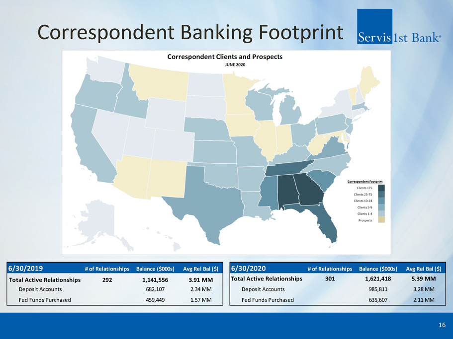 Our Management Team Thomas A. Broughton, III President and Chief Executive Officer ▪ Previously President and CEO of First Commercial Bank (acquired by Synovus Financial, 1992); subsequently, regional CEO for Synovus ▪ American Banker’s 2009 Community Banker of the Year ▪ 65 years old 15 William M. Foshee EVP and Chief Financial Officer ▪ Previously Chief Financial Officer of Heritage Financial Holding Corporation ▪ Certified public accountant ▪ 65 years old Clarence C. Pouncey , III EVP and Chief Operating Officer ▪ Previously with Wachovia; oversaw production functions in Alabama, Arizona, Tennessee and Texas ▪ Previously SVP of SouthTrust Bank ▪ 63 years old Henry F. Abbott SVP and Chief Credit Officer ▪ Previously Senior Vice President and Chief Credit Officer of the Correspondent Banking Division, ServisFirst Bank ▪ 40 years old Rodney E. Rushing EVP, Correspondent Banking Executive ▪ Previously Executive Vice President of Correspondent Banking, BBVA - Compass ▪ 62 years old ▪ Insiders own approximately 12% of outstanding shares
