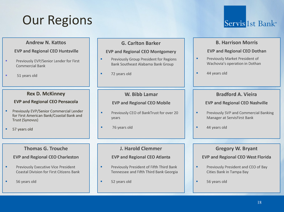 Our Regions Rex D. McKinney EVP and Regional CEO Pensacola ▪ Previously EVP/Senior Commercial Lender for First American Bank/Coastal Bank and Trust ( Synovus ) ▪ 57 years old 18 Andrew N. Kattos EVP and Regional CEO Huntsville ▪ Previously EVP/Senior Lender for First Commercial Bank ▪ 51 years old J. Harold Clemmer EVP and Regional CEO Atlanta ▪ Previously President of Fifth Third Bank Tennessee and Fifth Third Bank Georgia ▪ 52 years old W. Bibb Lamar EVP and Regional CEO Mobile ▪ Previously CEO of BankTrust for over 20 years ▪ 76 years old G. Carlton Barker EVP and Regional CEO Montgomery ▪ Previously Group President for Regions Bank Southeast Alabama Bank Group ▪ 72 years old B. Harrison Morris EVP and Regional CEO Dothan ▪ Previously Market President of Wachovia’s operation in Dothan ▪ 44 years old Gregory W. Bryant EVP and Regional CEO West Florida ▪ Previously President and CEO of Bay Cities Bank in Tampa Bay ▪ 56 years old Thomas G. Trouche EVP and Regional CEO Charleston ▪ Previously Executive Vice President Coastal Division for First Citizens Bank ▪ 56 years old Bradford A. Vieira EVP and Regional CEO Nashville ▪ Previously SVP and Commercial Banking Manager at ServisFirst Bank ▪ 44 years old