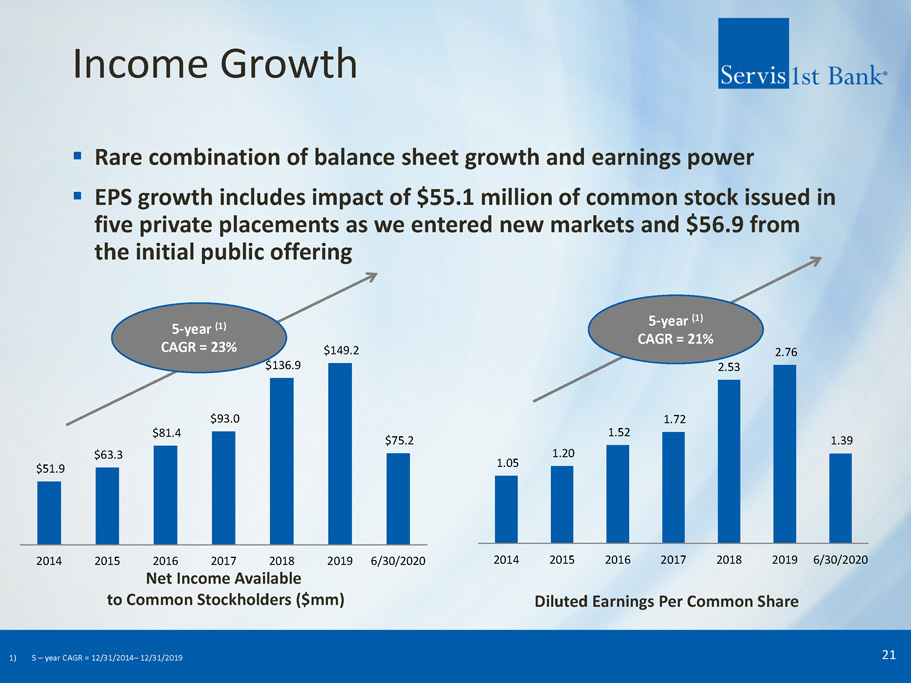 $3,398 $4,224 $5,420 $6,092 $6,916 $7,530 $9,343 2014 2015 2016 2017 2018 2019 6/30/2020 Balance Sheet Growth ▪ 5 - year (1) CAGR of gross loans and total deposits = 17% ▪ 5 - year (1) CAGR of non - interest bearing deposits = 17% 20 5 - year (1) CAGR = 17% 5 - year (1) CAGR = 17% Gross Loans ($mm) Total Deposits ($mm) $3,360 $4,216 $4,912 $5,851 $6,533 $7,261 $8,315 2014 2015 2016 2017 2018 2019 6/30/2020 1) 5 – year CAGR = 12/31/2014 – 12/31/2019