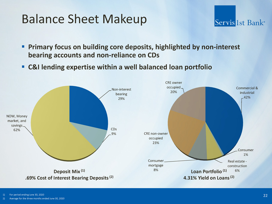1.05 1.20 1.52 1.72 2.53 2.76 1.39 2014 2015 2016 2017 2018 2019 6/30/2020 $51.9 $63.3 $81.4 $93.0 $136.9 $149.2 $75.2 2014 2015 2016 2017 2018 2019 6/30/2020 Income Growth ▪ Rare combination of balance sheet growth and earnings power ▪ EPS growth includes impact of $55.1 million of common stock issued in five private placements as we entered new markets and $56.9 from the initial public offering 21 5 - year (1) CAGR = 23% 5 - year (1) CAGR = 21% Net Income Available to Common Stockholders ($mm) Diluted Earnings Per Common Share 1) 5 – year CAGR = 12/31/2014 – 12/31/2019