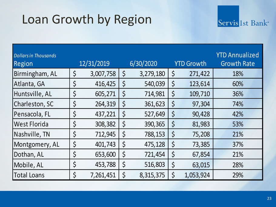 Loan Growth by Region 23 YTD Annualized Region 12/31/2019 6/30/2020 YTD Growth Growth Rate Birmingham, AL 3,007,758$ 3,279,180$ 271,422$ 18% Atlanta, GA 416,425$ 540,039$ 123,614$ 60% Huntsville, AL 605,271$ 714,981$ 109,710$ 36% Charleston, SC 264,319$ 361,623$ 97,304$ 74% Pensacola, FL 437,221$ 527,649$ 90,428$ 42% West Florida 308,382$ 390,365$ 81,983$ 53% Nashville, TN 712,945$ 788,153$ 75,208$ 21% Montgomery, AL 401,743$ 475,128$ 73,385$ 37% Dothan, AL 653,600$ 721,454$ 67,854$ 21% Mobile, AL 453,788$ 516,803$ 63,015$ 28% Total Loans 7,261,451$ 8,315,375$ 1,053,924$ 29% Dollars in Thousands