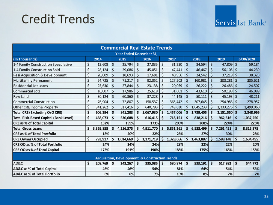 Credit Trends (In Thousands) 2014 2015 2016 2017 2018 2019 6/30/2020 1-4 Family Construction Speculative 13,608$ 25,794$ 27,835$ 31,230$ 34,594$ 47,809$ 59,184$ 1-4 Family Construction Sold 28,124$ 29,086$ 45,051$ 47,441$ 46,467$ 56,105$ 44,239$ Resi Acquisition & Development 20,009$ 18,693$ 17,681$ 40,956$ 24,542$ 37,219$ 38,328$ Multifamily Permanent 54,725$ 71,217$ 92,052$ 127,502$ 160,981$ 300,281$ 305,621$ Residential Lot Loans 25,630$ 27,844$ 23,138$ 20,059$ 26,222$ 26,486$ 24,507$ Commercial Lots 16,007$ 17,986$ 25,618$ 31,601$ 43,610$ 50,198$ 46,089$ Raw Land 30,124$ 60,360$ 37,228$ 44,145$ 50,111$ 45,193$ 48,211$ Commercial Construction 76,904$ 72,807$ 158,537$ 365,442$ 307,645$ 254,983$ 278,957$ Other CRE Income Property 341,262$ 517,416$ 640,793$ 748,630$ 1,045,233$ 1,333,276$ 1,499,060$ Total CRE (Excluding O/O CRE) 606,394$ 841,203$ 1,067,930$ 1,457,006$ 1,739,405$ 2,151,550$ 2,348,966$ Total Risk-Based Capital (Bank Level) 458,073$ 530,688$ 616,415$ 718,151$ 838,216$ 962,616$ 1,037,250$ CRE as % of Total Capital 132% 159% 173% 203% 208% 224% 226% Total Gross Loans 3,359,858$ 4,216,375$ 4,911,770$ 5,851,261$ 6,533,499$ 7,261,451$ 8,315,375$ CRE as % of Total Portfolio 18% 20% 22% 25% 27% 30% 28% CRE Owner Occupied 793,917$ 1,014,669$ 1,171,719$ 1,328,666$ 1,463,887$ 1,588,148$ 1,634,495$ CRE OO as % of Total Portfolio 24% 24% 24% 23% 22% 22% 20% CRE OO as % of Total Capital 173% 191% 190% 185% 175% 165% 158% AD&C 208,769$ 243,267$ 335,085$ 580,874$ 533,191$ 517,992$ 544,772$ AD&C as % of Total Capital 46% 46% 54% 81% 64% 54% 53% AD&C as % of Total Portfolio 6% 6% 7% 10% 8% 7% 7% Commercial Real Estate Trends Acquisition, Development, & Construction Trends Year Ended December 31, 25