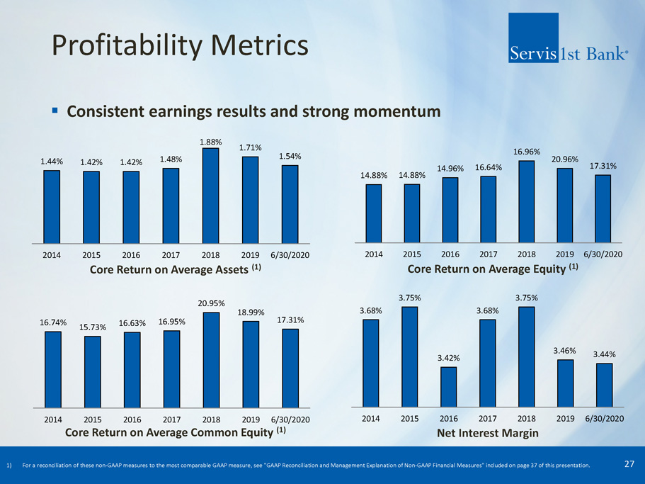 Credit Quality ▪ Strong loan growth while maintaining asset quality discipline 26 Allowance for Loan Losses / Total Loans Net Charge Offs / Total Average Loans Non - Performing Assets / Total Assets Non - Performing Loans / Total Loans 0.41% 0.26% 0.34% 0.26% 0.41% 0.50% 0.26% 2014 2015 2016 2017 2018 2019 6/30/2020 0.30% 0.18% 0.34% 0.19% 0.43% 0.50% 0.26% 2014 2015 2016 2017 2018 2019 6/30/2020 0.17% 0.13% 0.11% 0.29% 0.20% 0.33% 0.23% 2014 2015 2016 2017 2018 2019 6/30/2020 1.06% 1.03% 1.06% 1.02% 1.05% 1.05% 1.10% 2014 2015 2016 2017 2018 2019 6/30/2020