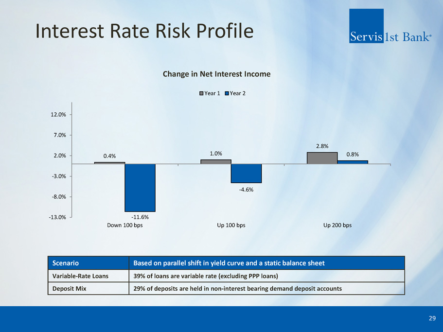 Interest Rate Risk Profile 29 Change in Net Interest Income Scenario Based on parallel shift in yield curve and a static balance sheet Variable - Rate Loans 39% of loans are variable rate (excluding PPP loans) Deposit Mix 29% of deposits are held in non - interest bearing demand deposit accounts 0.4% 1.0% 2.8% - 11.6% - 4.6% 0.8% -13.0% -8.0% -3.0% 2.0% 7.0% 12.0% Down 100 bps Up 100 bps Up 200 bps Year 1 Year 2