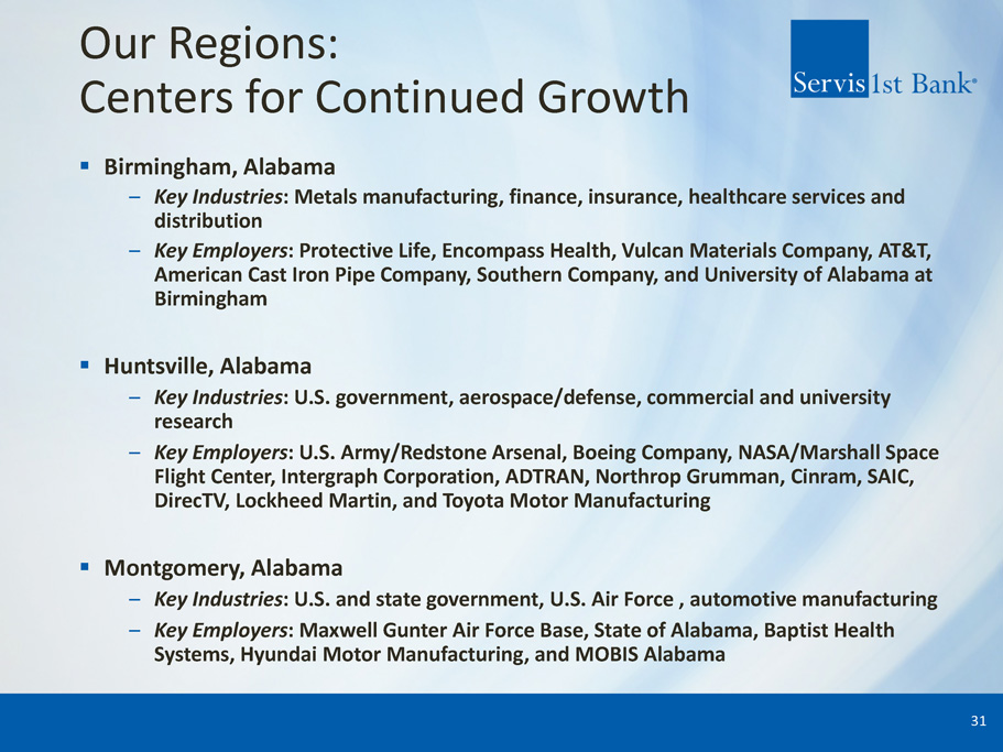 Our Regions: Centers for Continued Growth (cont.) ▪ Dothan, Alabama – Key Industries : Agriculture, manufacturing, and healthcare services – Key Employers : Southeast Alabama Medical Center, Wayne Farms, Southern Nuclear, Michelin Tire, Pemco World Air Services, Globe Motors, and AAA Cooper Transportation ▪ Pensacola, Florida – Key Industries : Military, health services, medical technology industries, and tourism – Key Employers : Eglin Air Force Base, Hurlburt Field, Pensacola Whiting Field, Pensacola Naval Air Station and Corry Station, Sacred Heart Health System, West Florida Regional Hospital, Gulf Power Company, University of West Florida, Solutia, and GE Wind Energy ▪ Mobile, Alabama – Key Industries : Aircraft assembly, aerospace, steel, ship building, maritime, construction, medicine, and manufacturing – Key Employers : Port of Mobile, Infirmary Health Systems, Austal USA, Brookley Aeroplex , ThyssenKrupp, Infirmary Health Systems, University of South Alabama, ST Aerospace Mobile, and EADS 32