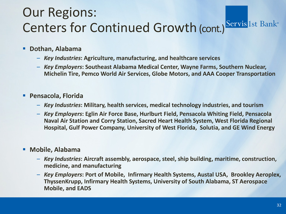 Our Regions: Centers for Continued Growth ▪ Birmingham, Alabama – Key Industries : Metals manufacturing, finance, insurance, healthcare services and distribution – Key Employers : Protective Life, Encompass Health, Vulcan Materials Company, AT&T, American Cast Iron Pipe Company, Southern Company, and University of Alabama at Birmingham ▪ Huntsville, Alabama – Key Industries : U.S. government, aerospace/defense, commercial and university research – Key Employers : U.S. Army/Redstone Arsenal, Boeing Company, NASA/Marshall Space Flight Center, Intergraph Corporation, ADTRAN, Northrop Grumman, Cinram, SAIC, DirecTV, Lockheed Martin, and Toyota Motor Manufacturing ▪ Montgomery, Alabama – Key Industries : U.S. and state government, U.S. Air Force , automotive manufacturing – Key Employers : Maxwell Gunter Air Force Base, State of Alabama, Baptist Health Systems, Hyundai Motor Manufacturing, and MOBIS Alabama 31