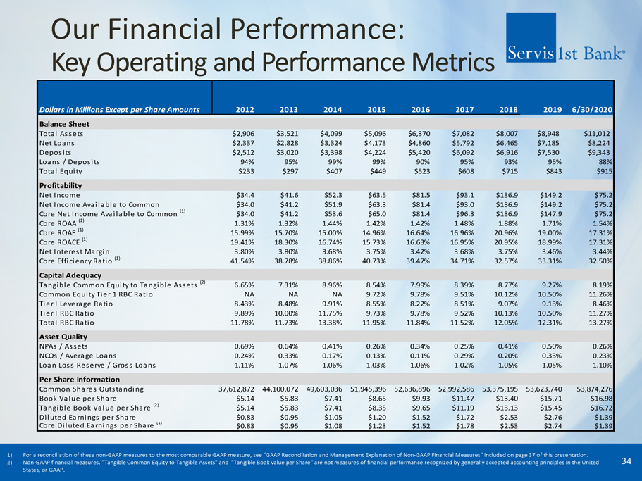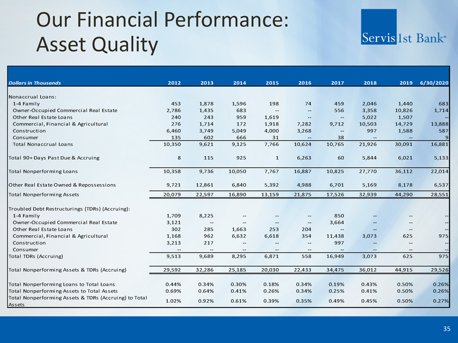 Our Financial Performance: Key Operating and Performance Metrics 34 2012 2013 2014 2015 2016 2017 2018 2019 6/30/2020 Balance Sheet Total Assets $2,906 $3,521 $4,099 $5,096 $6,370 $7,082 $8,007 $8,948 $11,012 Net Loans $2,337 $2,828 $3,324 $4,173 $4,860 $5,792 $6,465 $7,185 $8,224 Deposits $2,512 $3,020 $3,398 $4,224 $5,420 $6,092 $6,916 $7,530 $9,343 Loans / Deposits 94% 95% 99% 99% 90% 95% 93% 95% 88% Total Equity $233 $297 $407 $449 $523 $608 $715 $843 $915 Profitability Net Income $34.4 $41.6 $52.3 $63.5 $81.5 $93.1 $136.9 $149.2 $75.2 Net Income Available to Common $34.0 $41.2 $51.9 $63.3 $81.4 $93.0 $136.9 $149.2 $75.2 Core Net Income Available to Common (1) $34.0 $41.2 $53.6 $65.0 $81.4 $96.3 $136.9 $147.9 $75.2 Core ROAA (1) 1.31% 1.32% 1.44% 1.42% 1.42% 1.48% 1.88% 1.71% 1.54% Core ROAE (1) 15.99% 15.70% 15.00% 14.96% 16.64% 16.96% 20.96% 19.00% 17.31% Core ROACE (1) 19.41% 18.30% 16.74% 15.73% 16.63% 16.95% 20.95% 18.99% 17.31% Net Interest Margin 3.80% 3.80% 3.68% 3.75% 3.42% 3.68% 3.75% 3.46% 3.44% Core Efficiency Ratio (1) 41.54% 38.78% 38.86% 40.73% 39.47% 34.71% 32.57% 33.31% 32.50% Capital Adequacy Tangible Common Equity to Tangible Assets (2) 6.65% 7.31% 8.96% 8.54% 7.99% 8.39% 8.77% 9.27% 8.19% Common Equity Tier 1 RBC Ratio NA NA NA 9.72% 9.78% 9.51% 10.12% 10.50% 11.26% Tier I Leverage Ratio 8.43% 8.48% 9.91% 8.55% 8.22% 8.51% 9.07% 9.13% 8.46% Tier I RBC Ratio 9.89% 10.00% 11.75% 9.73% 9.78% 9.52% 10.13% 10.50% 11.27% Total RBC Ratio 11.78% 11.73% 13.38% 11.95% 11.84% 11.52% 12.05% 12.31% 13.27% Asset Quality NPAs / Assets 0.69% 0.64% 0.41% 0.26% 0.34% 0.25% 0.41% 0.50% 0.26% NCOs / Average Loans 0.24% 0.33% 0.17% 0.13% 0.11% 0.29% 0.20% 0.33% 0.23% Loan Loss Reserve / Gross Loans 1.11% 1.07% 1.06% 1.03% 1.06% 1.02% 1.05% 1.05% 1.10% Per Share Information Common Shares Outstanding 37,612,872 44,100,072 49,603,036 51,945,396 52,636,896 52,992,586 53,375,195 53,623,740 53,874,276 Book Value per Share $5.14 $5.83 $7.41 $8.65 $9.93 $11.47 $13.40 $15.71 $16.98 Tangible Book Value per Share (2) $5.14 $5.83 $7.41 $8.35 $9.65 $11.19 $13.13 $15.45 $16.72 Diluted Earnings per Share $0.83 $0.95 $1.05 $1.20 $1.52 $1.72 $2.53 $2.76 $1.39 Core Diluted Earnings per Share (1) $0.83 $0.95 $1.08 $1.23 $1.52 $1.78 $2.53 $2.74 $1.39 Dollars in Millions Except per Share Amounts 1) For a reconciliation of these non - GAAP measures to the most comparable GAAP measure, see "GAAP Reconciliation and Management Exp lanation of Non - GAAP Financial Measures" included on page 37 of this presentation. 2) Non - GAAP financial measures. "Tangible Common Equity to Tangible Assets" and "Tangible Book value per Share" are not measures o f financial performance recognized by generally accepted accounting principles in the United States, or GAAP.