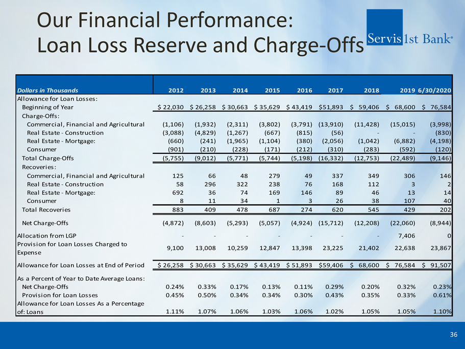 Our Financial Performance: Asset Quality 35 Dollars in Thousands 2012 2013 2014 2015 2016 2017 2018 2019 6/30/2020 Nonaccrual Loans: 1-4 Family 453 1,878 1,596 198 74 459 2,046 1,440 683 Owner-Occupied Commercial Real Estate 2,786 1,435 683 -- -- 556 3,358 10,826 1,714 Other Real Estate Loans 240 243 959 1,619 -- -- 5,022 1,507 -- Commercial, Financial & Agricultural 276 1,714 172 1,918 7,282 9,712 10,503 14,729 13,888 Construction 6,460 3,749 5,049 4,000 3,268 -- 997 1,588 587 Consumer 135 602 666 31 -- 38 -- -- 9 Total Nonaccrual Loans 10,350 9,621 9,125 7,766 10,624 10,765 21,926 30,091 16,881 Total 90+ Days Past Due & Accruing 8 115 925 1 6,263 60 5,844 6,021 5,133 Total Nonperforming Loans 10,358 9,736 10,050 7,767 16,887 10,825 27,770 36,112 22,014 Other Real Estate Owned & Repossessions 9,721 12,861 6,840 5,392 4,988 6,701 5,169 8,178 6,537 Total Nonperforming Assets 20,079 22,597 16,890 13,159 21,875 17,526 32,939 44,290 28,551 Troubled Debt Restructurings (TDRs) (Accruing): 1-4 Family 1,709 8,225 -- -- -- 850 -- -- -- Owner-Occupied Commercial Real Estate 3,121 -- -- -- -- 3,664 -- -- -- Other Real Estate Loans 302 285 1,663 253 204 -- -- -- -- Commercial, Financial & Agricultural 1,168 962 6,632 6,618 354 11,438 3,073 625 975 Construction 3,213 217 -- -- -- 997 -- -- -- Consumer -- -- -- -- -- -- -- -- -- Total TDRs (Accruing) 9,513 9,689 8,295 6,871 558 16,949 3,073 625 975 Total Nonperforming Assets & TDRs (Accruing) 29,592 32,286 25,185 20,030 22,433 34,475 36,012 44,915 29,526 Total Nonperforming Loans to Total Loans 0.44% 0.34% 0.30% 0.18% 0.34% 0.19% 0.43% 0.50% 0.26% Total Nonperforming Assets to Total Assets 0.69% 0.64% 0.41% 0.26% 0.34% 0.25% 0.41% 0.50% 0.26% Total Nonperforming Assets & TDRs (Accruing) to Total Assets 1.02% 0.92% 0.61% 0.39% 0.35% 0.49% 0.45% 0.50% 0.27%