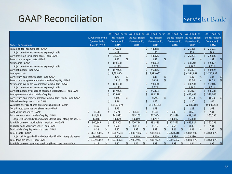 GAAP Reconciliation 38 Dollars in Thousands Provision for income taxes - GAAP $ 37,618 $ 44,258 $ 25,465 $ 21,601 Adjustment for non-routine expense/credit 421 -132 829 865 Core provision for income taxes - non-GAAP $ 38,039 $ 44,126 $ 26,294 $ 22,466 Return on average assets - GAAP 1.73 % 1.43 % 1.38 % 1.39 % Net income - GAAP $ 149,180 $ 93,092 $ 63,540 $ 52,377 Adjustment for non-routine expense/credit -1,185 3,274 1,767 1,612 Core net income - non-GAAP $ 147,995 $ 96,366 $ 65,307 $ 53,989 Average assets $ 8,638,604 $ 6,495,067 $4,591,861 $3,757,932 Core return on average assets - non-GAAP 1.71 % 1.48 % 1.42 % 1.44 % Return on average common stockholders' equity - GAAP 19.15 % 16.37 % 15.30 % 16.23 % Net income available to common stockholders - GAAP $ 149,180 $ 93,030 $ 63,260 $ 51,946 Adjustment for non-routine expense/credit -1,185 3,274 1,767 1,612 Core net income available to common stockholders - non-GAAP $ 147,995 $ 96,304 $ 65,027 $ 53,558 Average common stockholders' equity $ 779,071 $ 568,228 $ 413,445 $ 320,005 Core return on average common stockholders' equity - non-GAAP 18.99 % 16.95 % 15.73 % 16.74 % Diluted earnings per share - GAAP $ 2.76 $ 1.72 $ 1.20 $ 1.05 Weighted average shares outstanding, diluted - GAAP 54,103,074 54,123,957 52,885,108 49,636,442 Core diluted earnings per share - non-GAAP $ 2.73 $ 1.78 $ 1.23 $ 1.08 Book value per share - GAAP $ 16.98 $ 15.71 $ 13.40 $ 11.47 $ 9.93 $ 8.65 $ 7.41 Total common stockholders' equity - GAAP 914,588 842,682 715,203 607,604 522,889 449,147 367,255 Adjusted for goodwill and other identifiable intangible assets 14,043 14,179 14,449 14,787 14,996 15,330 - Tangible common stockholders' equity - non-GAAP $ 900,545 $ 828,503 $700,754 $ 592,885 $507,893 $ 433,817 $ 367,255 Tangible book value per share - non-GAAP $ 16.72 $ 15.45 $ 13.13 $ 11.19 $ 9.65 $ 8.35 $ 7.41 Stockholders' equity to total assets - GAAP 8.31 % 9.42 % 8.93 % 8.58 % 8.21 % 8.81 % 8.96 % Total assets - GAAP $11,012,195 $ 8,947,653 $8,007,382 $ 7,082,384 $6,370,448 $5,095,509 $4,098,679 Adjusted for goodwill and other identifiable intangible assets 14,043 14,179 14,449 14,719 14,996 15,330 - Total tangible assets - non-GAAP $10,998,152 $ 8,933,474 $7,992,933 $ 7,067,665 $6,355,452 $5,080,179 $4,098,679 Tangible common equity to total tangible assets - non-GAAP 8.19 % 9.27 % 8.77 % 8.39 % 7.99 % 8.54 % 8.96 % As Of and For the Quarter Ended June 30, 2020 As Of and For the Year Ended December 31, 2019 As Of and For the Year Ended December 31, 2014 As Of and For the Year Ended December 31, 2015 As Of and For the Year Ended December 31, 2016 As Of and For the Year Ended December 31, 2017 As Of and For the Year Ended December 31, 2018