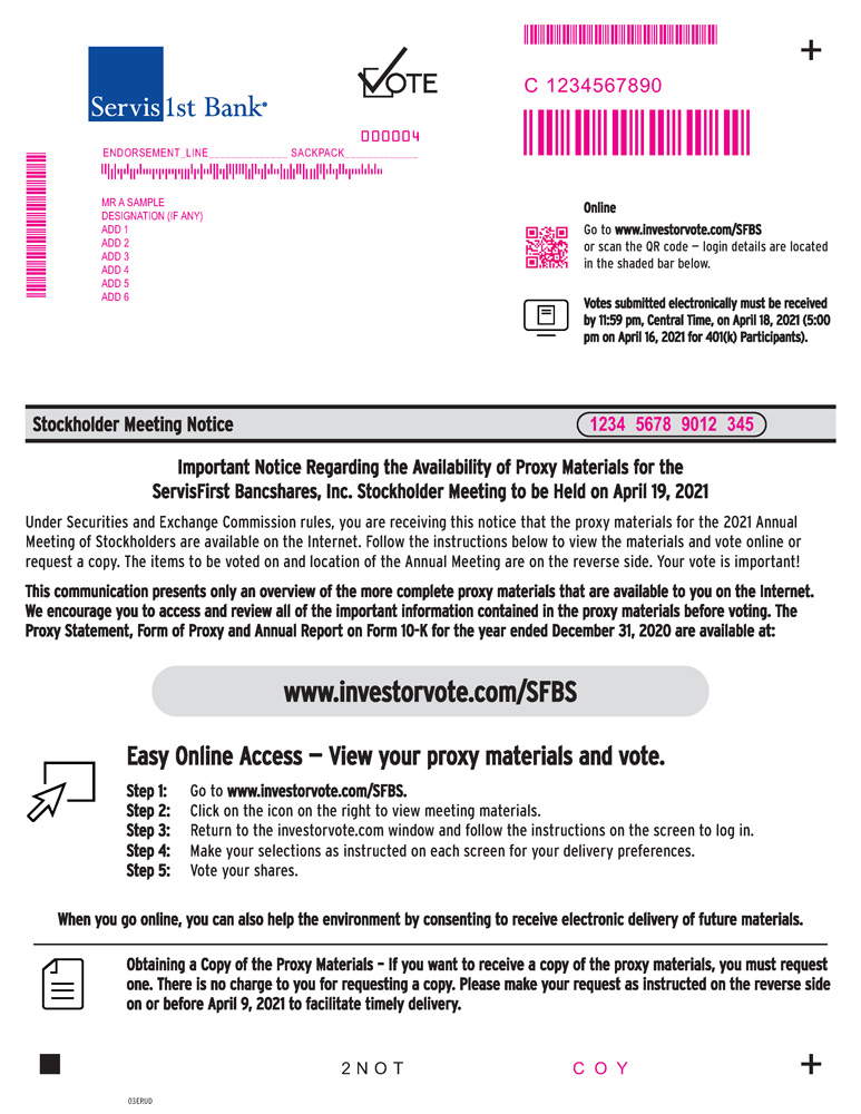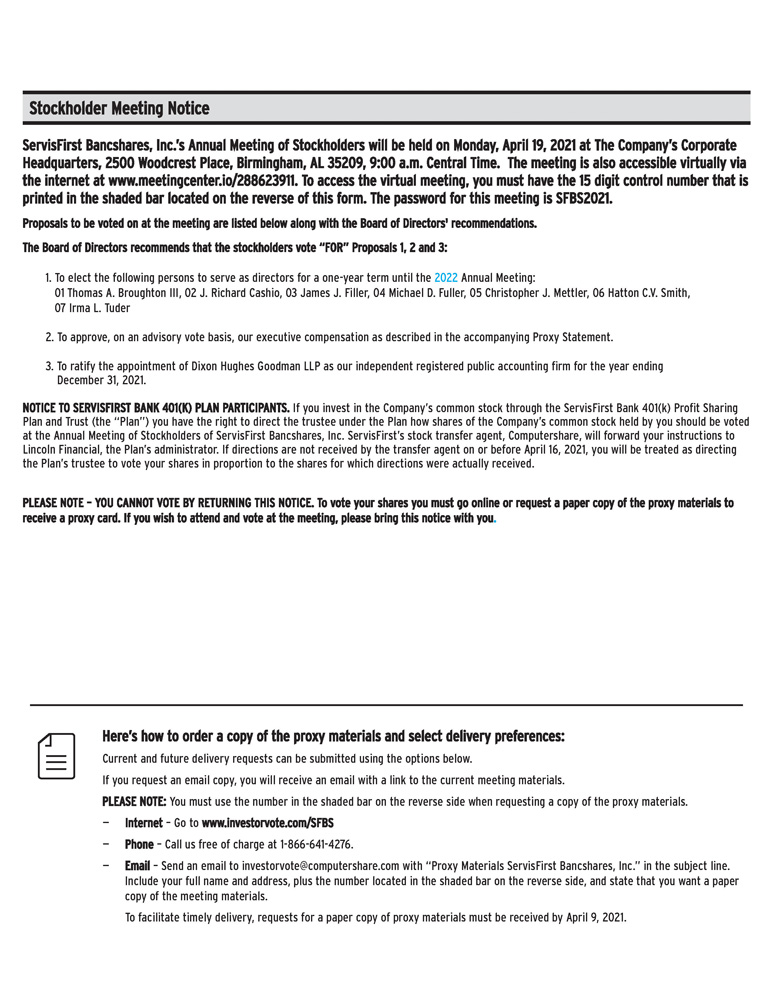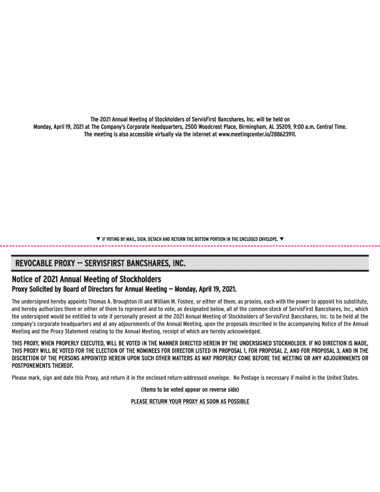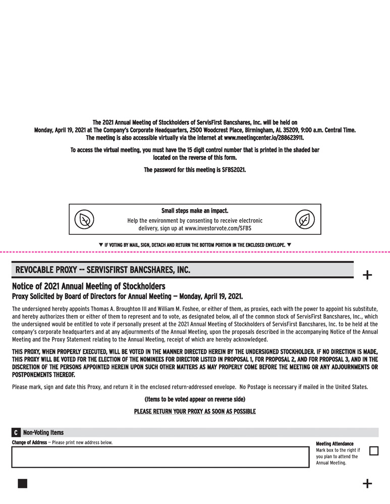 You are cordially invited to attend the Annual Meeting of Stockholders of ServisFirst Bancshares, Inc. Our Annual Meeting will be held at the company’s corporate headquarters, located at 2500 Woodcrest Place, Birmingham, Alabama 35209, on April 19, 2021, at 9:00 a.m., Central Daylight Time. As a result of public health and travel guidance due to COVID-19, you also will be able to attend the annual meeting, vote and submit your questions during the annual meeting by visiting www.meetingcenter.io/288623911. We may announce alternative arrangements for the meeting, which may include switching to a virtual only meeting format, or changing the time, date or location of the annual meeting. If we take this step, we will announce any changes in advance in a press release available on our website www.servisfirstbancshares.com and filed with the Securities Exchange Commission in addition to proxy materials, and as otherwise required by applicable state law.
