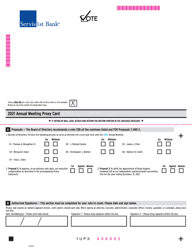 If you invest in our common stock through the company stock fund in the ServisFirst Bank 401(k) Profit Sharing Plan and Trust, you will receive instructions for submitting your voting directions from the 401(k) plan’s administrator, Lincoln Financial. The 401(k) plan’s trustees will vote shares held by the 401(k) plan in accordance with the tabulation. Any shares for which the trustees do not received timely voting directions will be voted by the trustees in proportion to the shares for which directions were actually received. To allow the trustees sufficient time to process voting directions, the voting deadline for 401(k) plan participants is 5:00 p.m., Central Time, on April 16, 2021.