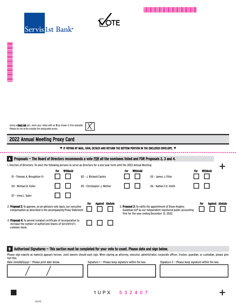 1 U P X F o r W ithhold 1. Election of Directors: To elect the following persons to serve as directors for a one - year term until the 2023 Annual Meeting: For Withhold For Withhold 01 - Thomas A. Broughton III 02 - J. Richard Cashio 03 - James J. Filler 04 - Michael D . F uller 05 - Chri s t opher J . M e t tler 06 - Ha t t on C . V . Smith 07 - Irma L. Tuder Using a black ink pen, mark your votes with an X as shown in this example. Please do not write outside the designated areas. 0 3L9 X C + + Please sign exactly as name(s) appears hereon. Joint owners should each sign. When signing as attorney, executor, administrator, corporate officer, trustee, guardian, or custodian, please give full title. Date (mm/dd/yyyy) — Please print date below. Signature 1 — Please keep signature within the box. Signature 2 — Please keep signature within the box. Authorized Signatures — This section must be completed for your vote to count. Please date and sign below. B T IF VOTING BY MAIL, SIGN, DETACH AND RETURN THE BOTTOM PORTION IN THE ENCLOSED ENVELOPE. T 2022 Annual Meeting Proxy Card Proposals — The Board of Directors recommends a vote FOR all the nominees listed and FOR Proposals 2, 3 and 4. A 2. Proposal 2: To approve, on an advisory vote basis, our executive compensation as described in the accompanying Proxy Statement. 3 . P r o p o s a l 3 : T o ratify the appointment o f Di x on Hughe s Goodman LLP as our independent registered public accounting firm for the year ending December 31, 2022. For Against Abstain For Against Abstain 4. Proposal 4: To amend restated certificate of incorporation to increase the number of authorized shares of ServisFirst’s common stock. MMMMMMMM M 5 3 2 4 0 7 MMMMMMMMMMMM