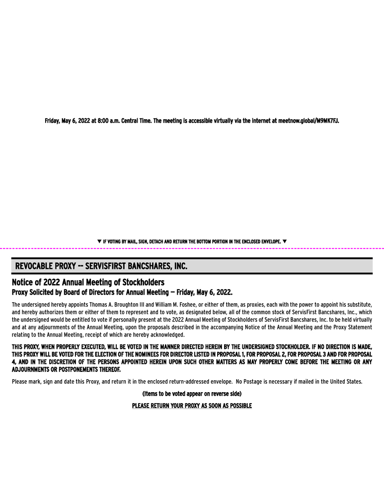 RE V OC ABLE P R O X Y -- SE R VIS F IR S T B AN C SHAR E S , IN C . Notice of 2022 Annual Meeting of Stockholders Proxy Solicited by Board of Directors for Annual Meeting — Friday, May 6 , 2022 . The undersigned hereby appoints Thomas A . Broughton III and William M . Foshee, or either of them, as proxies, each with the power to appoint his substitute, and hereby authorizes them or either of them to represent and to vote, as designated below, all of the common stock of ServisFirst Bancshares, Inc . , which the undersigned would be entitled to vote if personally present at the 2022 Annual Meeting of Stockholders of ServisFirst Bancshares, Inc . to be held virtually and at any adjournments of the Annual Meeting, upon the proposals described in the accompanying Notice of the Annual Meeting and the Proxy Statement relating to the Annual Meeting, receipt of which are hereby acknowledged . THIS PROXY, WHEN PROPERLY EXECUTED, WILL BE VOTED IN THE MANNER DIRECTED HEREIN BY THE UNDERSIGNED STOCKHOLDER . IF NO DIRECTION IS MADE, THIS PROXY WILL BE VOTED FOR THE ELECTION OF THE NOMINEES FOR DIRECTOR LISTED IN PROPOSAL 1 , FOR PROPOSAL 2 , FOR PROPOSAL 3 AND FOR PROPOSAL 4 , AND IN THE DISCRETION OF THE PERSONS APPOINTED HEREIN UPON SUCH OTHER MATTERS AS MAY PROPERLY COME BEFORE THE MEETING OR ANY ADJOURNMENTS OR POSTPONEMENTS THEREOF . Please mark, sign and date this Proxy, and return it in the enclosed return - addressed envelope . No Postage is necessary if mailed in the United States . (Items to be voted appear on reverse side) PLE A SE RETUR N Y OU R P R O X Y A S SOO N A S P OS SIBLE T IF VOTING BY MAIL, SIGN, DETACH AND RETURN THE BOTTOM PORTION IN THE ENCLOSED ENVELOPE. T Friday, May 6, 2022 at 8:00 a.m. Central Time. The meeting is accessible virtually via the internet at meetnow.global/M9MK7FJ.